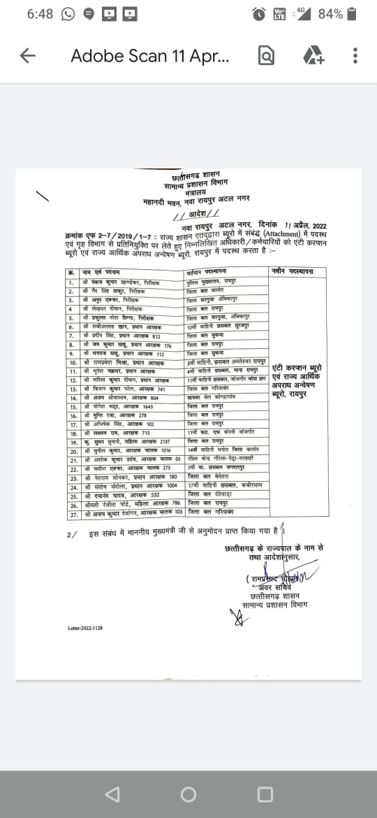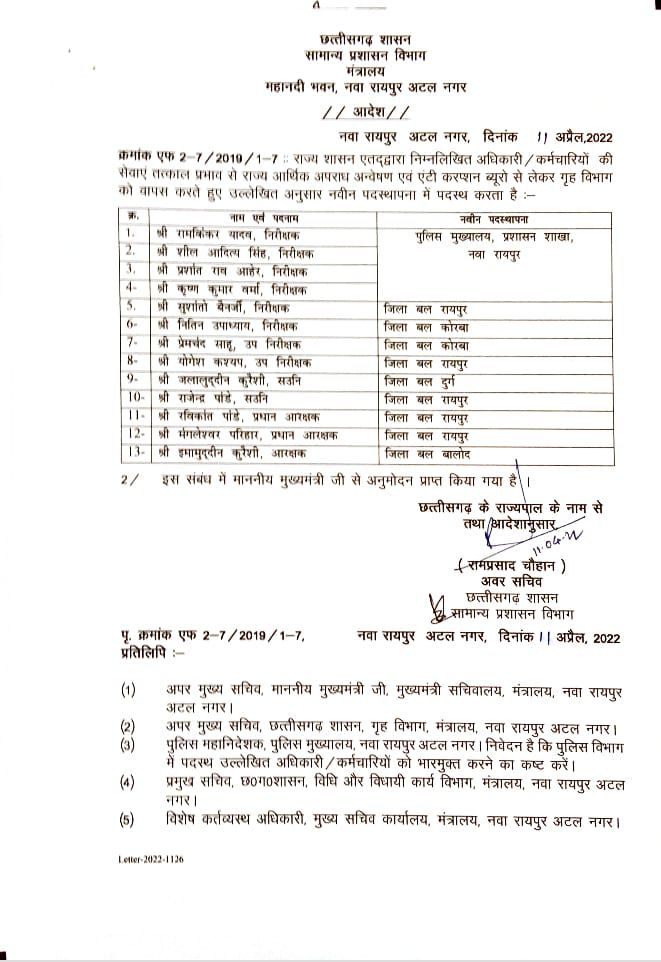रायपुर, 11 अप्रैल। राज्य सरकार ने एसीबी ईओडब्ल्यू में बड़ी सर्जरी की है। इसमें 50 से अधिक अधिकारी कर्मचारियों को बदला गया है। आदेश के मुताबिक अमृता सोरी को एएसपी डोंगरगढ़, और पंकज चंद्रा का मुंगेली तबादला रोक दिया गया है। वहीं 27 नये अधिकारी और सिपाही पदस्थ किए गए हैं।