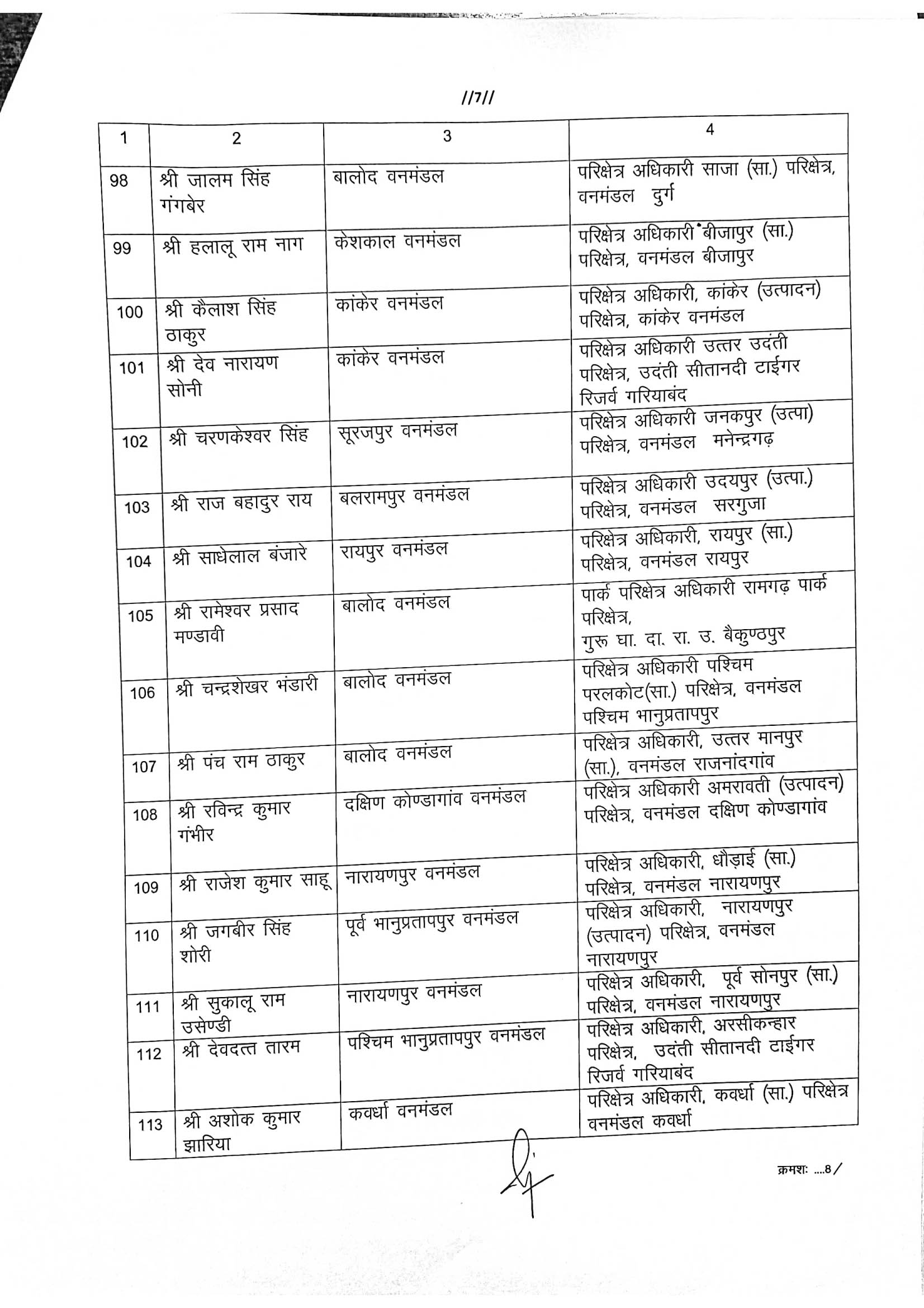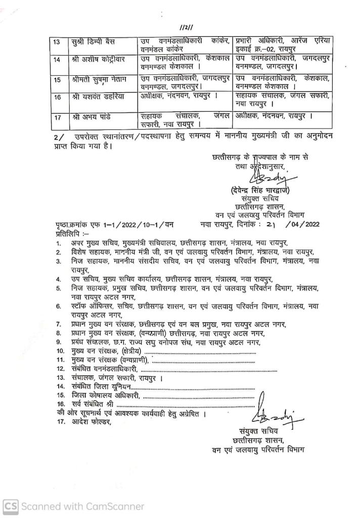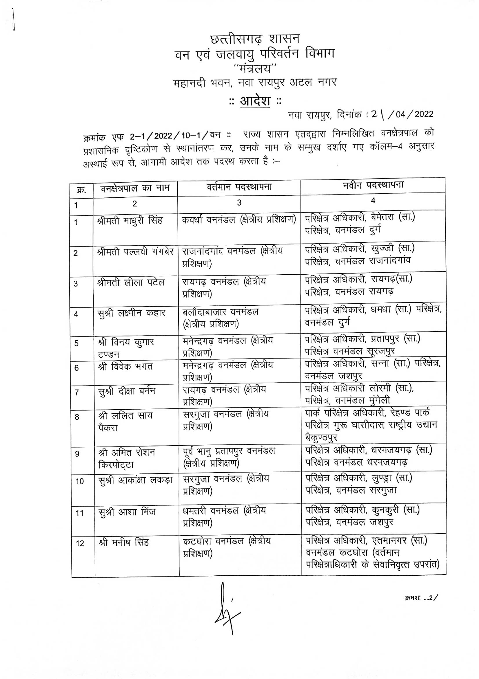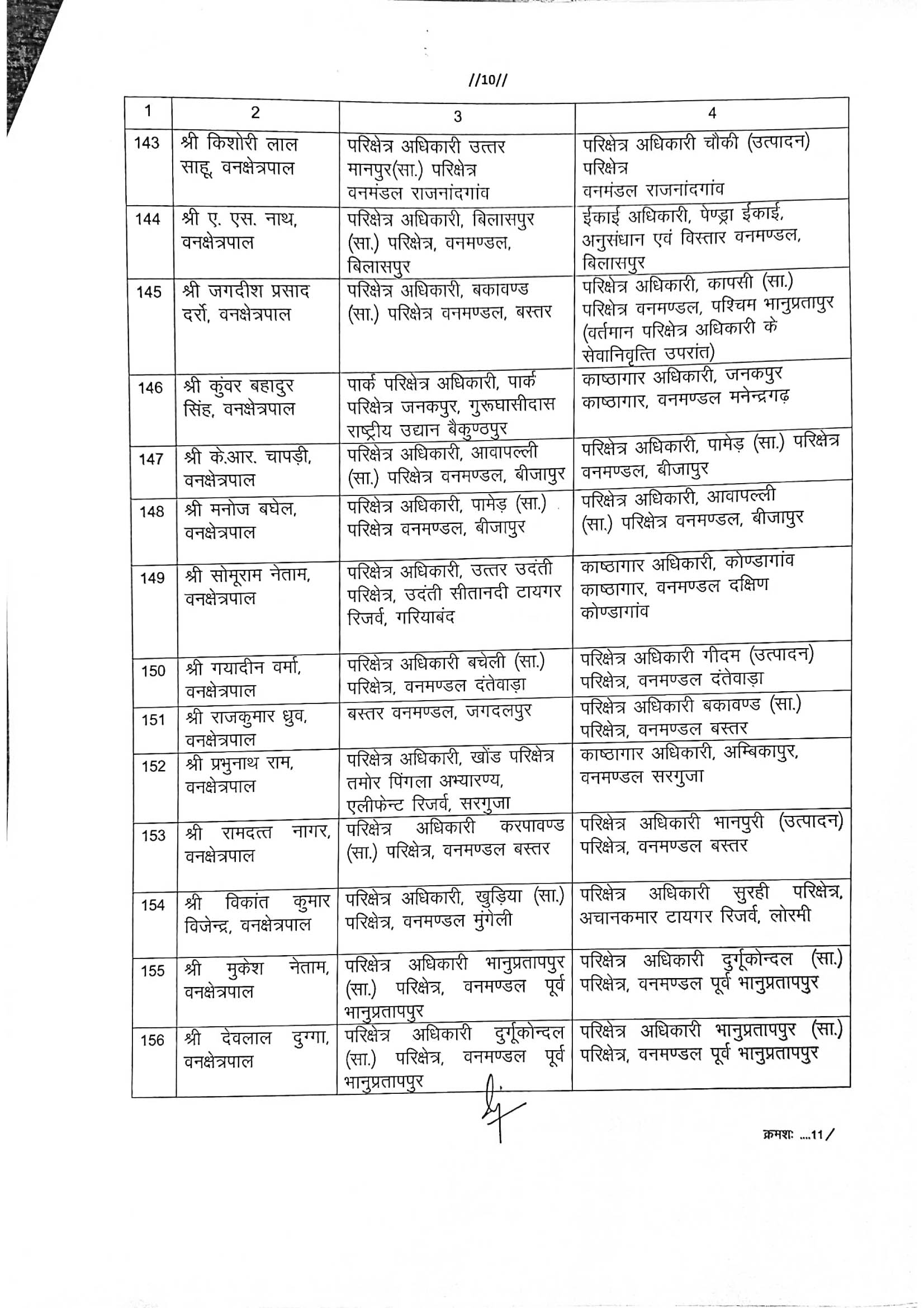 रायपुर, 21 अप्रैल। वन विभाग में डेढ़ सौ से अधिक रेंजर, और अन्य अफसरों के तबादले किए गए हैं। इस आशय के आदेश जारी कर दिया गया है ।