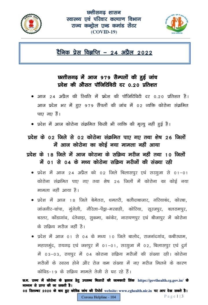 रायपुर, 24 अप्रैल। राज्य में आज रात 09.00 बजे तक 2 कोरोना पॉजिटिव मिले हैं। राज्य के स्वास्थ्य विभाग के आंकड़ों के मुताबिक आज रात तक 26 जिलों में कोरोना पॉजिटिव नहीं मिले हैं।