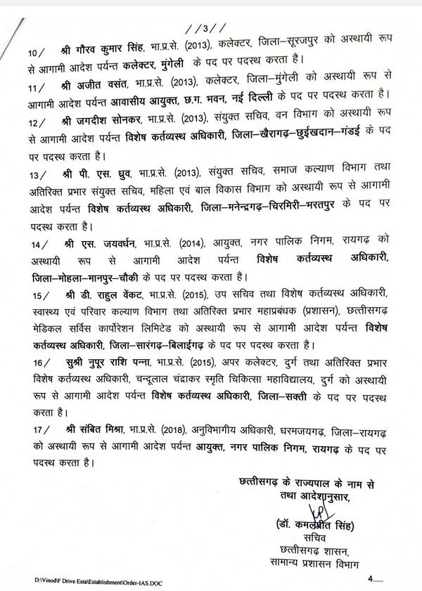 रायपुर, 25 अप्रैल। राज्य सरकार ने 17 आईएएस अफसरों के तबादले किए हैं। इस कड़ी में चार नए जिलों में ओएसडी की पदस्थापना की गई है। यही नहीं, दो कलेक्टरों को भी बदला गया है। विधिवत आदेश जारी कर दिए गए हैं।