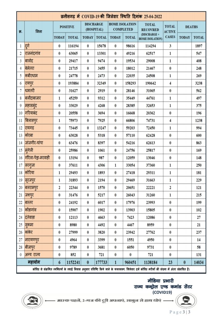राज्य शासन के स्वास्थ्य विभाग के आंकड़ों के मुताबिक दुर्ग 0, राजनांदगांव 0, बालोद 0, बेमेतरा 0, कबीरधाम 0, रायपुर 0, धमतरी 0, बलौदाबाजार 1, महासमुंद 0, गरियाबंद 0, बिलासपुर 1, रायगढ़ 0, कोरबा 0, जांजगीर-चांपा 0, मुंगेली 0, जीपीएम 0, सरगुजा 0, कोरिया 1, सूरजपुर 1, बलरामपुर 2, जशपुर 0, बस्तर 0, कोंडागांव 0, दंतेवाड़ा 0, सुकमा 0, कांकेर 0, नारायणपुर 0, बीजापुर 0, अन्य राज्य 0 कोरोना पॉजिटिव मिले हैं।
