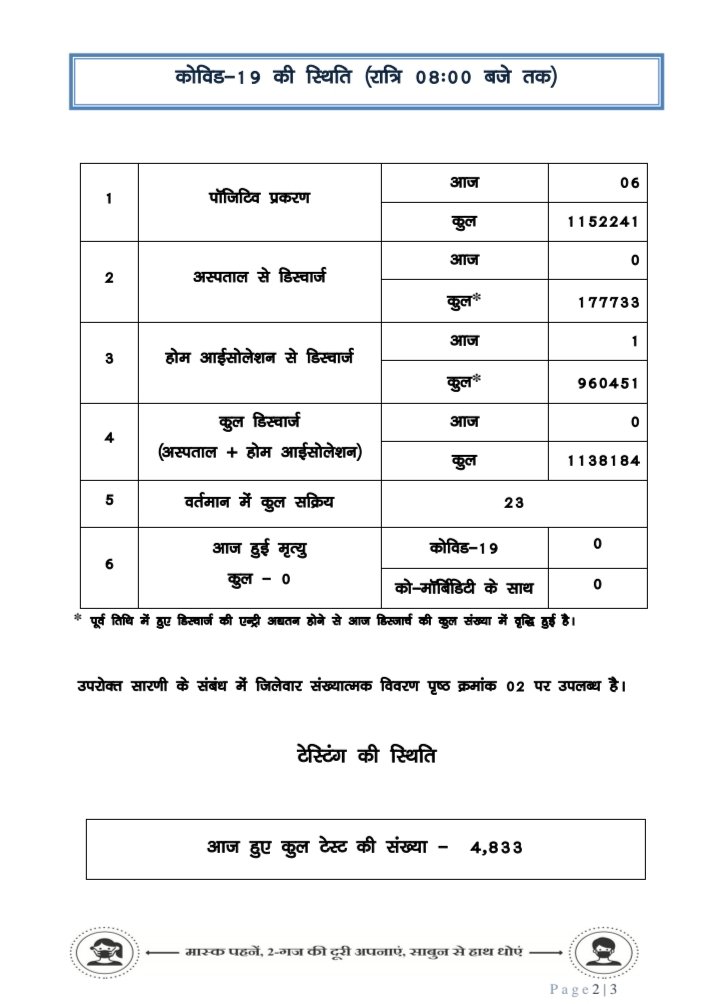 प्रदेश में आज रात तक 6 पॉजिटिव, सर्वाधिक बलरामपुर जिले में, 23 जिलों में शून्य
