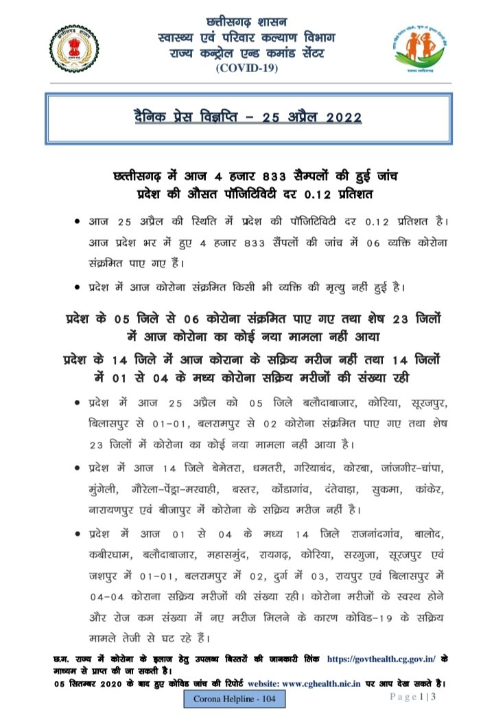 रायपुर, 25 अप्रैल। राज्य में आज रात 09.00 बजे तक 6 कोरोना पॉजिटिव मिले हैं। इनमें सबसे अधिक 2 बलरामपुर जिले से हैं। राज्य के स्वास्थ्य विभाग के इन आंकड़ों के मुताबिक आज रात तक किसी भी जिले में 5 से अधिक कोरोना पॉजिटिव नहीं मिले हैं। आज कुल 23 जिलों मेें एक भी पॉजिटिव नहीं मिले हैं।