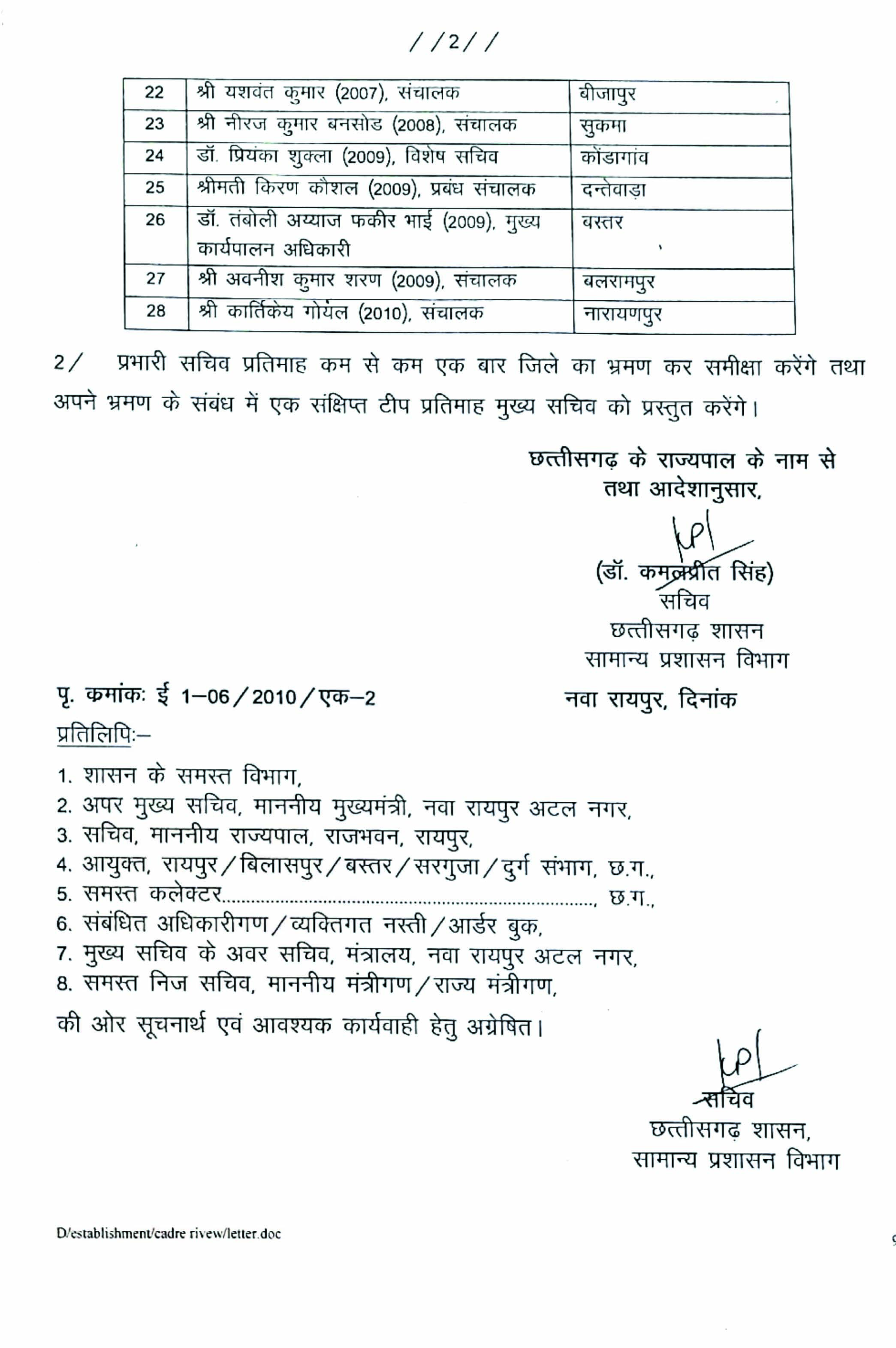 जिलों के प्रभारी सचिवों की नियुक्ति