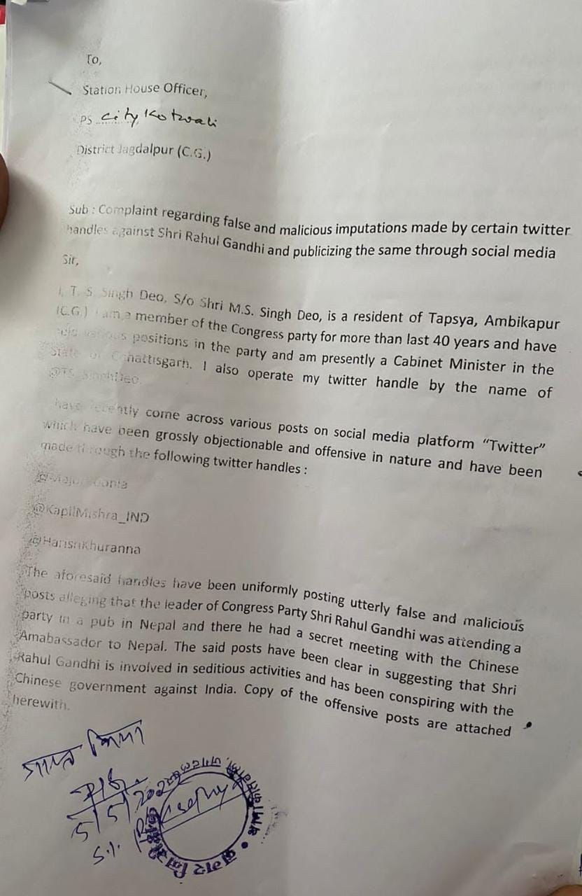 कांग्रेस के पूर्व राष्ट्रीय अध्यक्ष राहुल गांधी के खिलाफ ट्वीट पर स्वास्थ्य मंत्री टीएस सिंहदेव ने नाराजगी जताई है। सिंहदेव शुक्रवार को जगदलपुर पुलिस स्टेशन पहुंचे, और ट्वीट को आपत्तिजनक बताते हुए एफआईआर दर्ज कराई है।