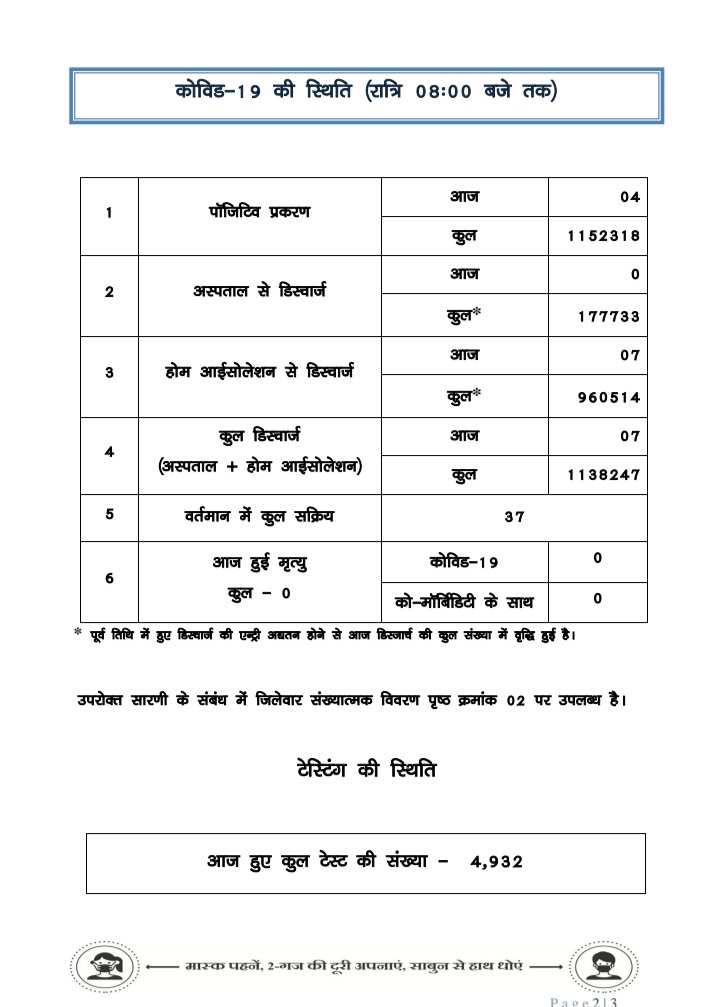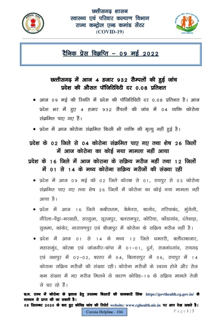 प्रदेश में आज रात तक 4 पॉजिटिव, सर्वाधिक रायपुर जिले में, 26 जिलों में शून्य