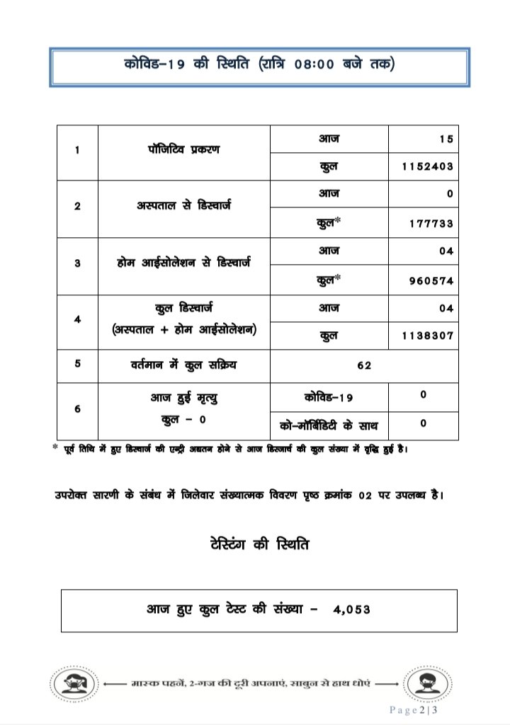प्रदेश में आज रात तक 15 पॉजिटिव, सर्वाधिक बिलासपुर जिले में, 21 जिलों में शून्य