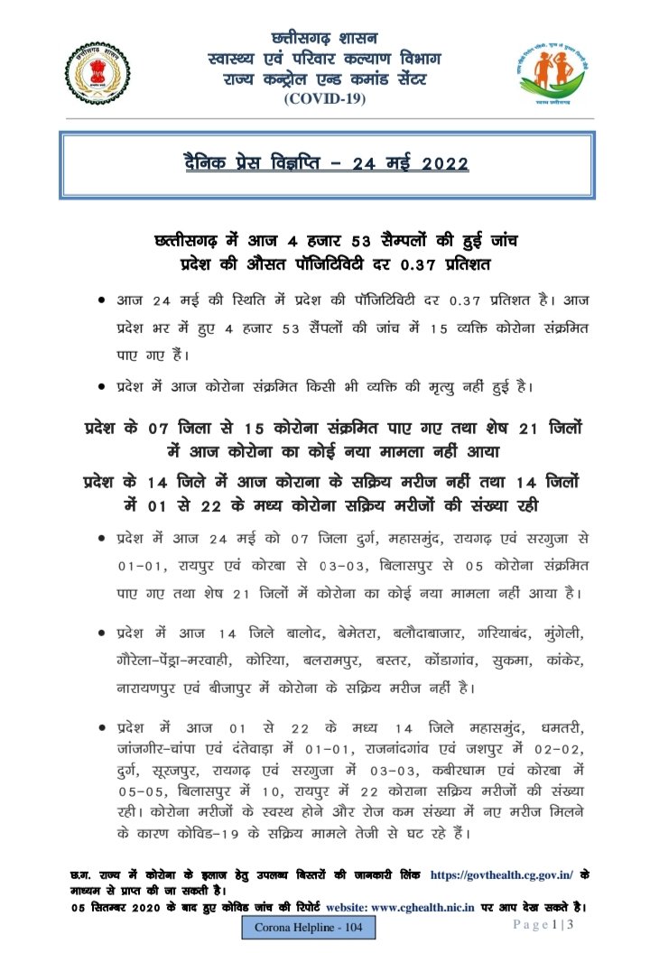 रायपुर, 24 मई। राज्य में आज रात 09.00 बजे तक 15 कोरोना पॉजिटिव मिले हैं। इनमें सबसे अधिक 5 बिलासपुर जिले से हैं। राज्य के स्वास्थ्य विभाग के इन आंकड़ों के मुताबिक आज रात तक किसी भी जिले में 10 से अधिक कोरोना पॉजिटिव नहीं मिले हैं। आज कुल 21 जिलों मेें एक भी पॉजिटिव नहीं मिले हैं।