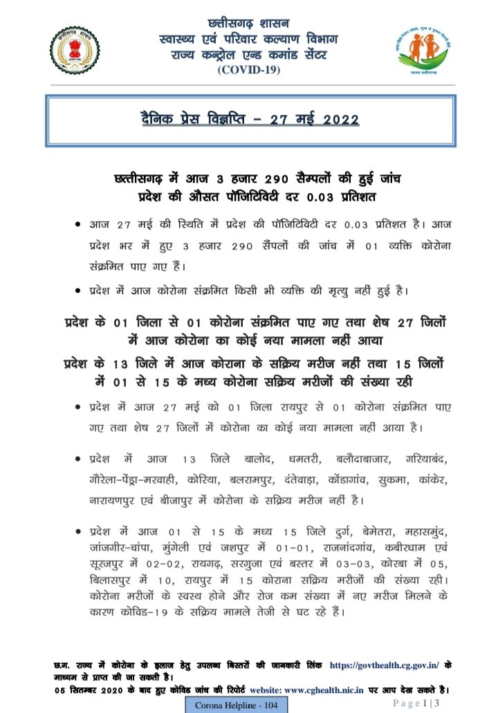 रायपुर, 27 मई। राज्य में आज रात 09.00 बजे तक 1 कोरोना पॉजिटिव मिले हैं। राज्य के स्वास्थ्य विभाग के आंकड़ों के मुताबिक आज रात तक 27 जिलों में कोरोना पॉजिटिव नहीं मिले हैं।