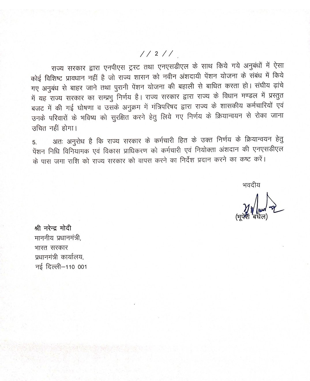 रायपुर। छत्तीसगढ़ के शासकीय कर्मचारियों के हित के लिए मुख्यमंत्री भूपेश बघेल ने प्रधानमंत्री नरेंद्र मोदी को पत्र लिखा है। इसमें उन्होंने नवीन अंशदायी पेंशन योजना के तहत एनएसडीएल को अंतरित 17 हजार 240 करोड़ रुपए छत्तीसगढ़ सरकार को वापस करने पेंशन निधि विनियामक और विकास प्राधिकरण को निर्देशित करने का अनुरोध किया है।