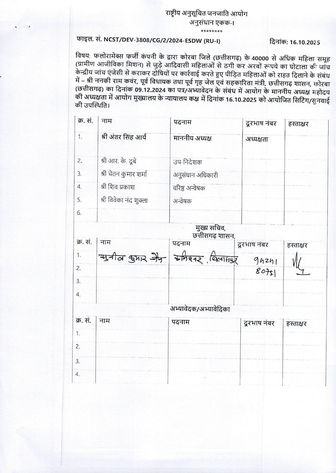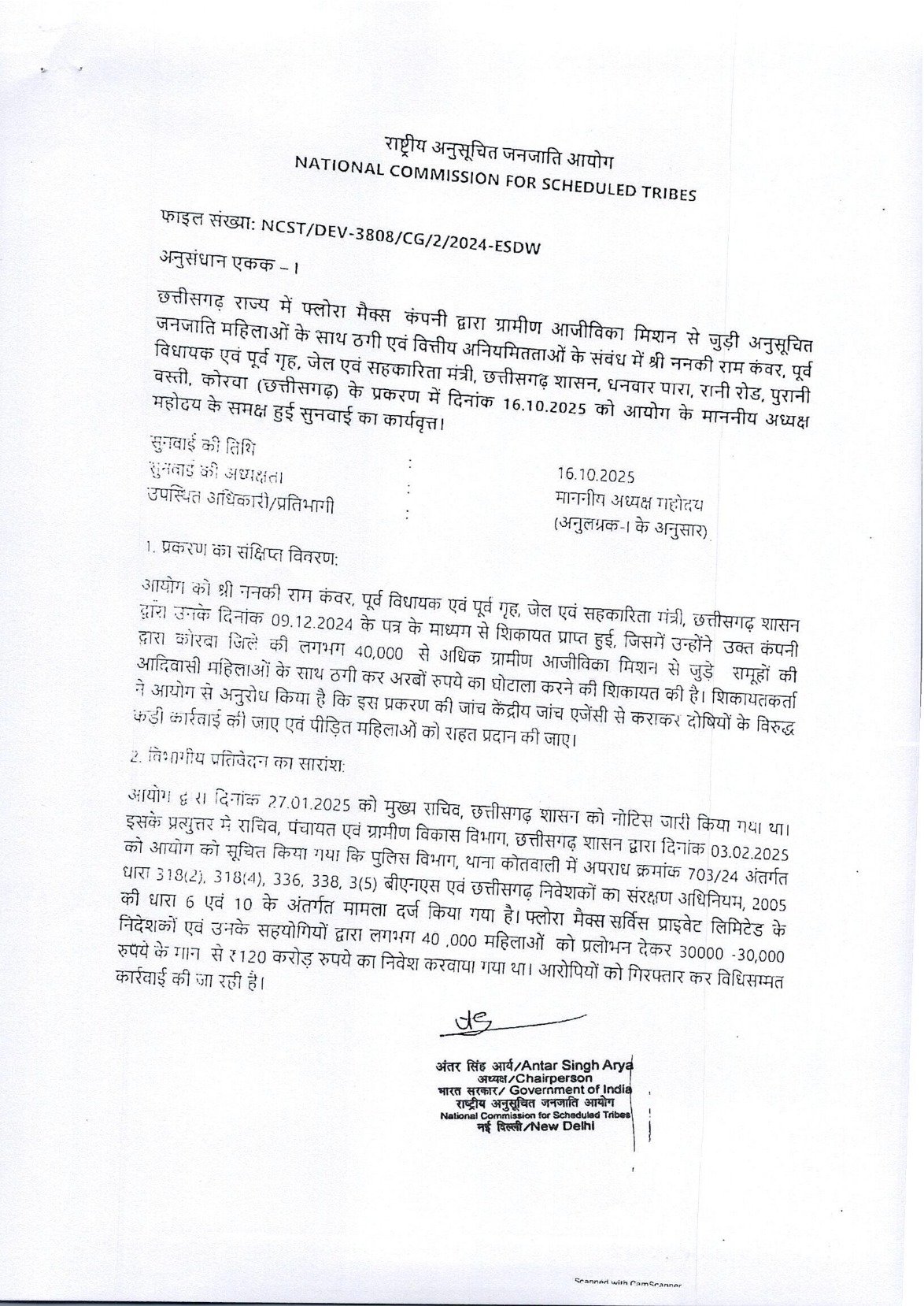 रायपुर, 6 नवंबर। राष्ट्रीय अनुसूचित जनजाति आयोग ने चिटफंड कंपनी फ्लोरामेक्स द्वारा आदिवासी महिलाओं से ठगी के मामले में कड़ा रूख अपनाया है। आयोग ने मुख्य सचिव को पत्र लिखकर प्रकरण की केंद्रीय एजेंसी से जांच कराकर दोषियों के खिलाफ कार्रवाई की अनुशंसा की है, और 30 दिन के भीतर कार्रवाई की रिपोर्ट आयोग को प्रस्तुत करने के आदेश दिए हैं।