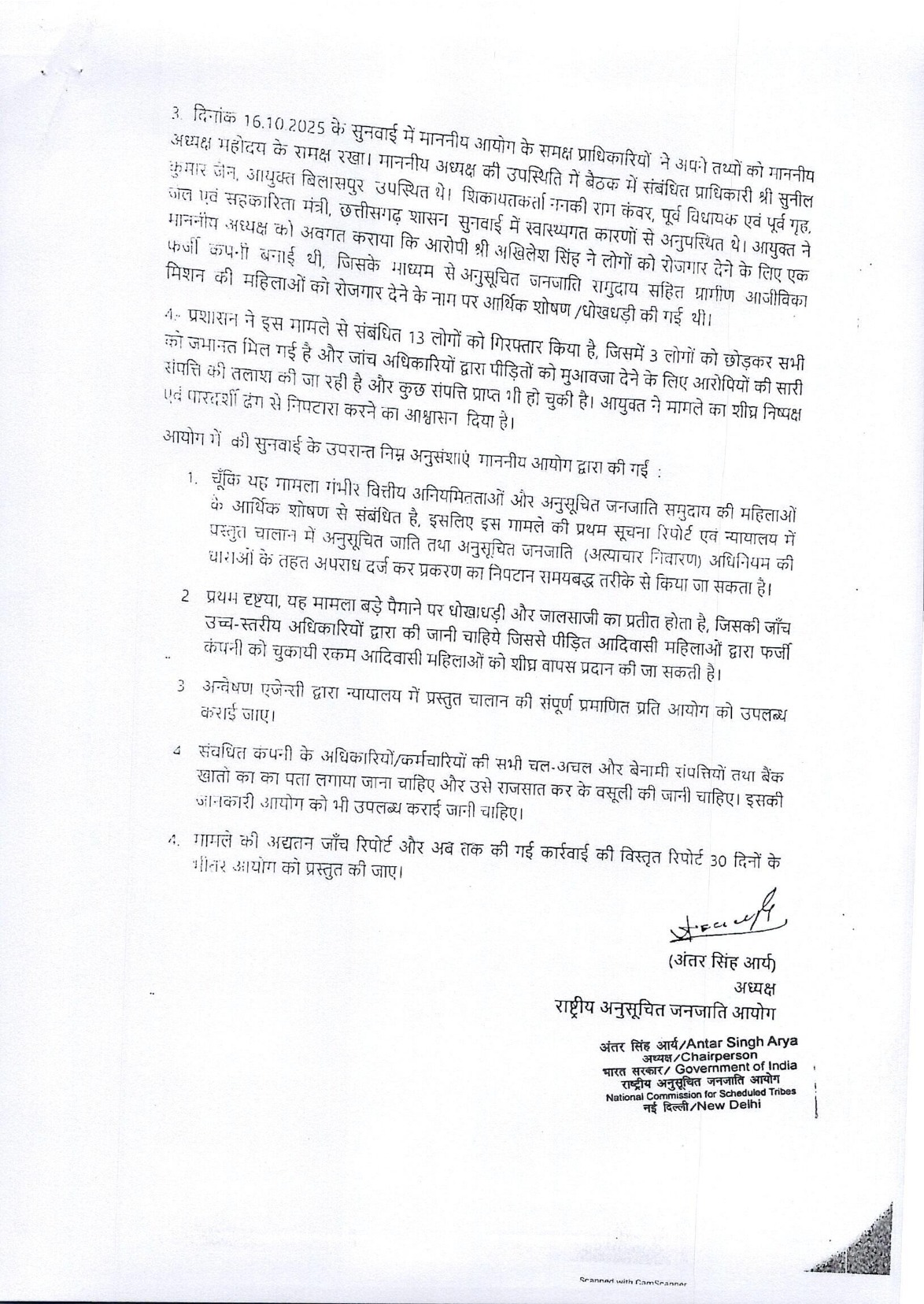 आयोग ने प्रकरण की जांच के बाद पाया कि मामला गंभीर वित्तीय अनियमितताओं और अनुसूचित जनजाति समुदाय की महिलाओं के आर्थिक शोषण से जुड़ा है। इसलिए मामले की एफआईआर और न्यायालय में प्रस्तुत चालान में अनुसूचित जनजाति अत्याचार निवारण अधिनियम की धाराओं के तहत अपराध दर्ज कर प्रकरण का समयबद्ध तरीके से निपटान करने का सुझाव दिया है।