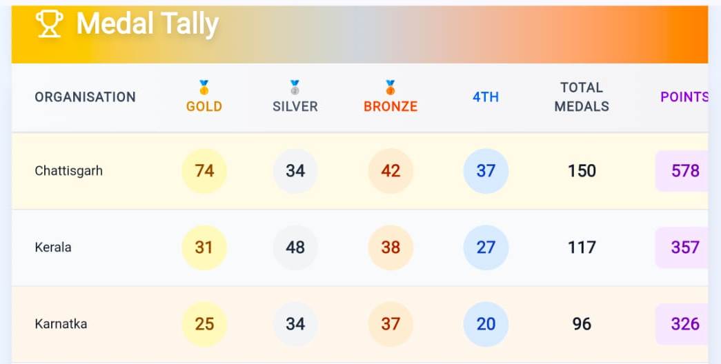 150 मेडल और 578 अंक के साथ पहले स्थान पर