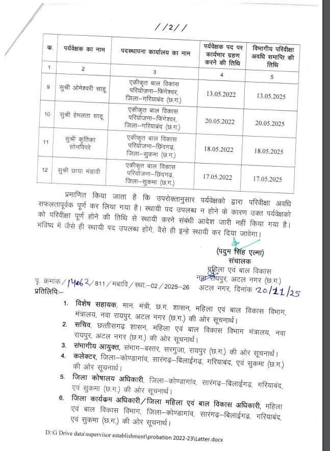 रायपुर, 20 नवंबर । महिला बाल विकास विभाग (मबवि)ने सीधी भर्ती और परिसीमित सीधी भर्ती के पदों पर नियुक्त एक दर्जन पर्यवेक्षकों की परीविक्षावधि समाप्त कर दिया है।
