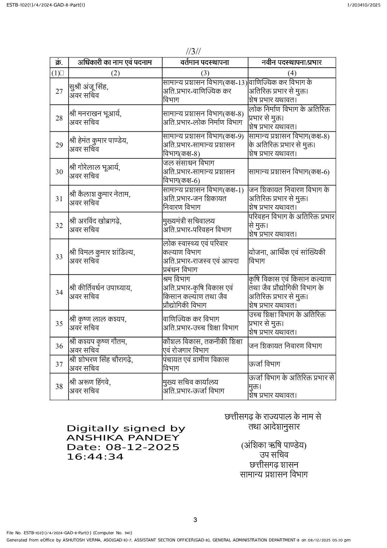 रायपुर, 8 दिसंबर । राज्य शासन ने सचिवालय सेवा और राप्रसे के तीन दर्जन से अधिक अफसरों के तबादले किए हैं। इनमें 1 संयुक्त सचिव, 19 उप सचिव,17 अवर सचिव और एक ओएसडी शामिल हैं। इनमें 17 राप्रसे के अफसर हैं जो मंत्रालय में उप या अवर सचिव पद पर कार्यरत हैं।