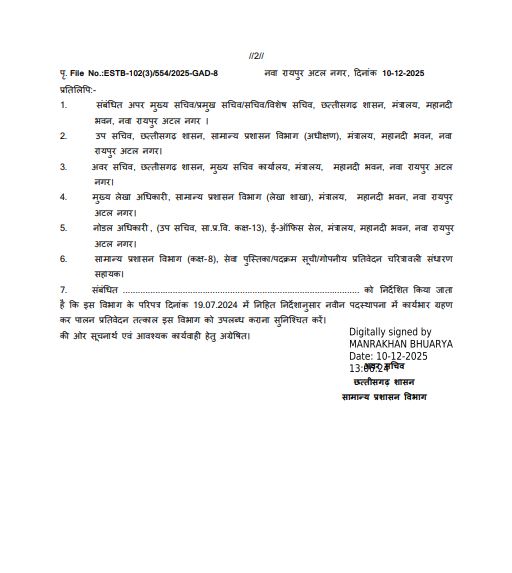 रायपुर, 10 दिसंबर । जीएडी ने बुधवार को मंत्रालय सेवा के दो एएसओ, 4 ग्रेड -1 लिपिकों के विभाग बदले हैं। आदेश देखें --