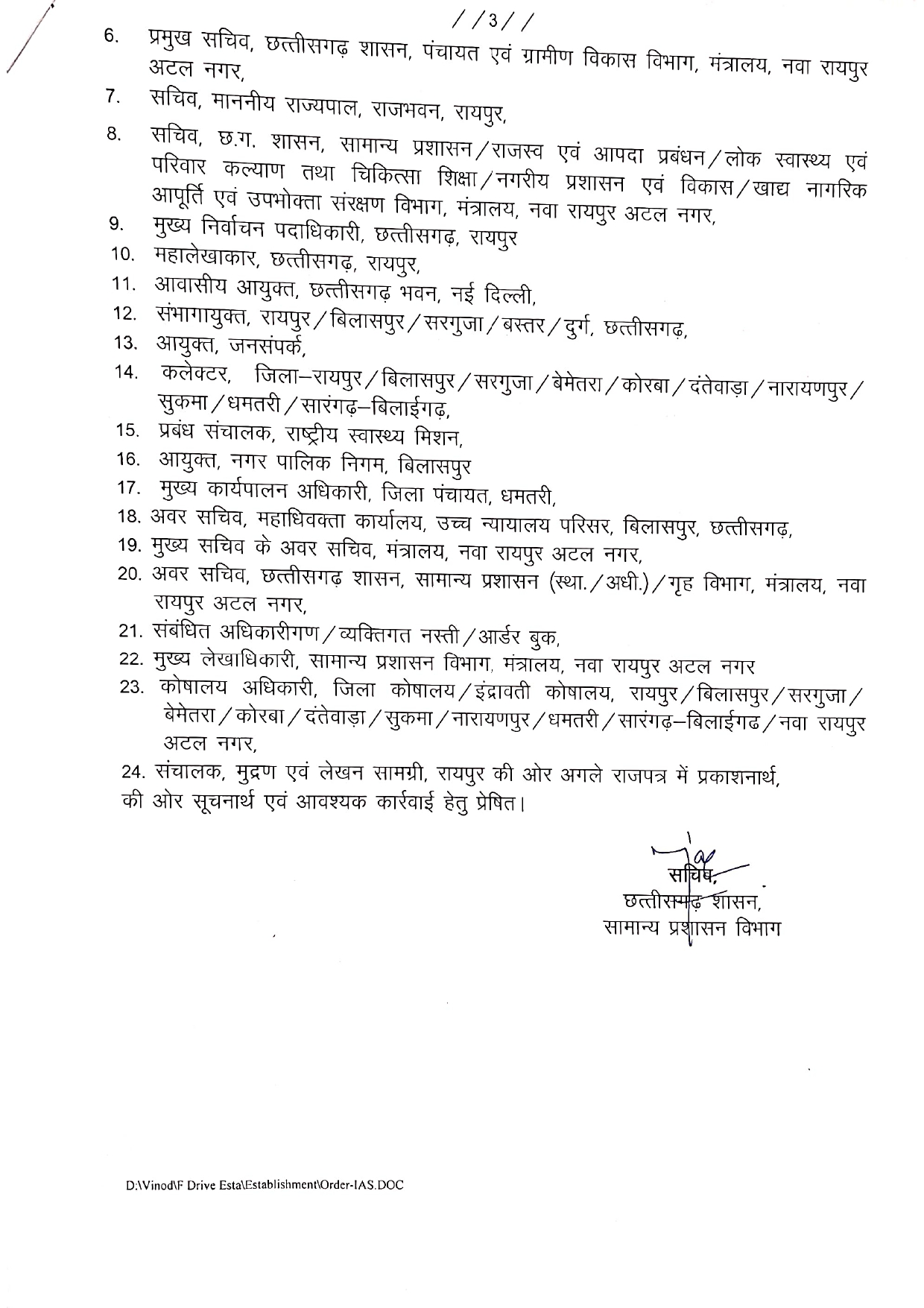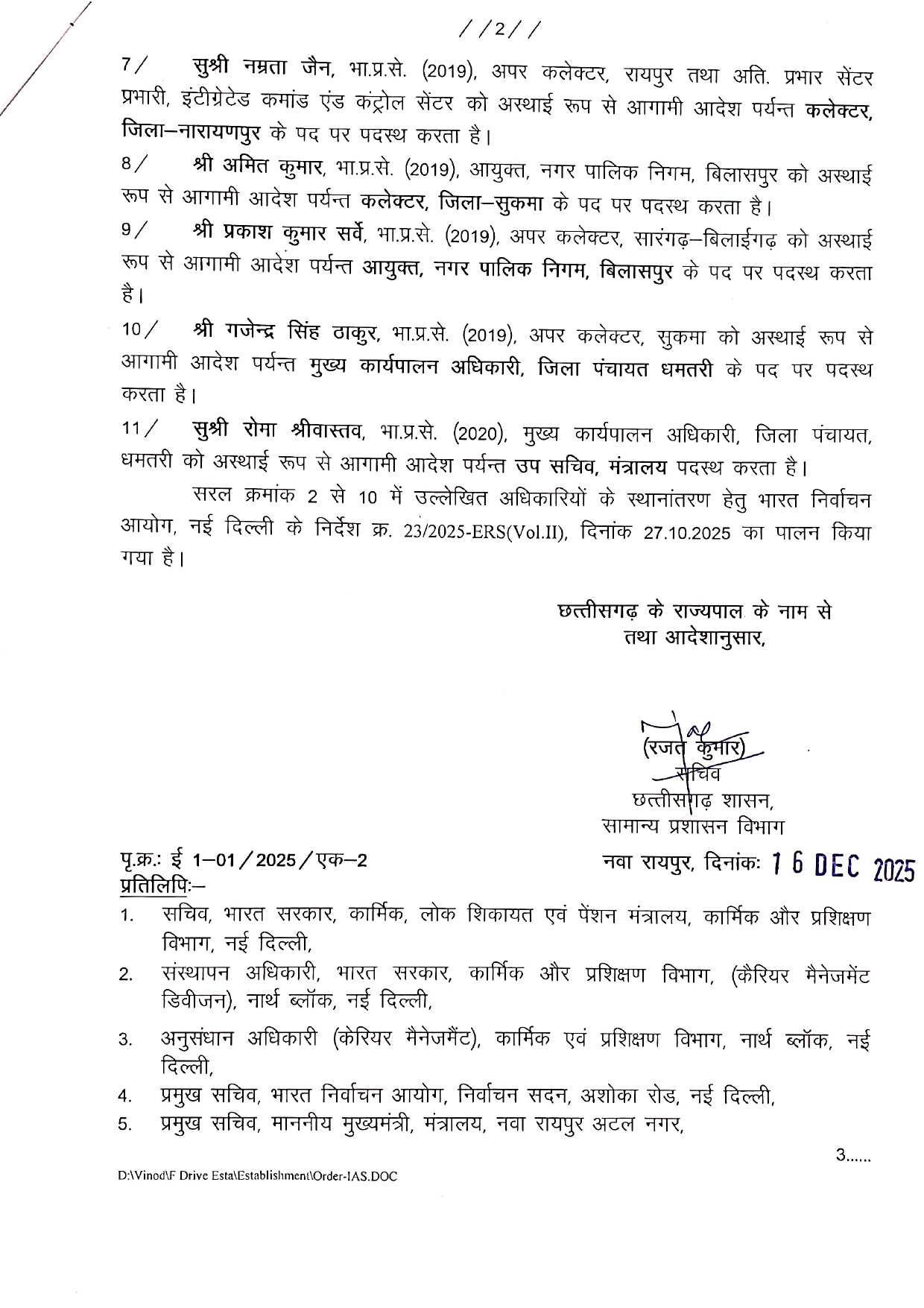रायपुर, 16 दिसंबर। भारतीय प्रशासनिक सेवा के 11 अफसरों को इधर से उधर किया गया है। इस कड़ी में आधा दर्जन कलेक्टर बदले गए हैं। इनमें बेमेतरा, कोरबा, सरगुजा, दंतेवाड़ा, नारायणपुर, और सुकमा शामिल हंै।