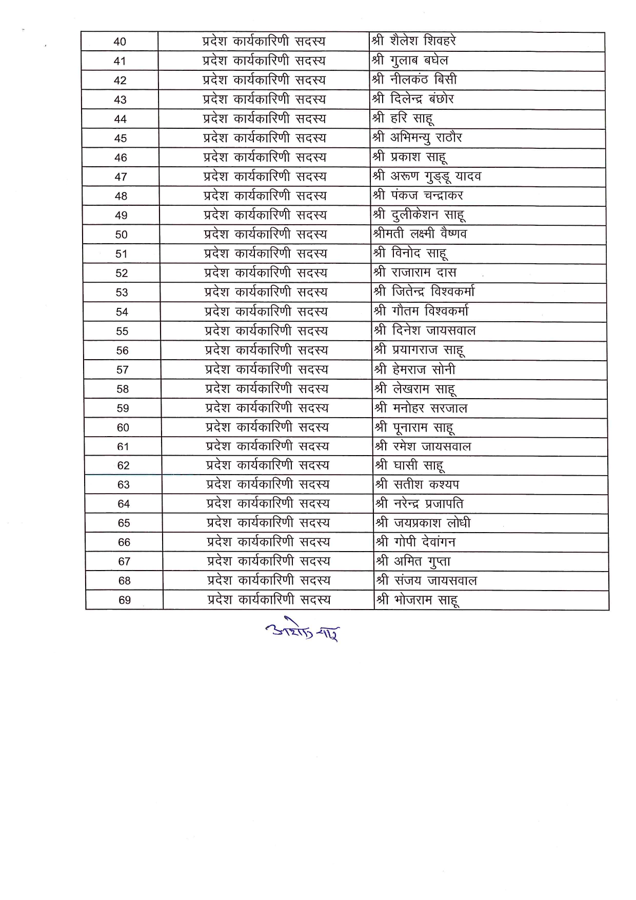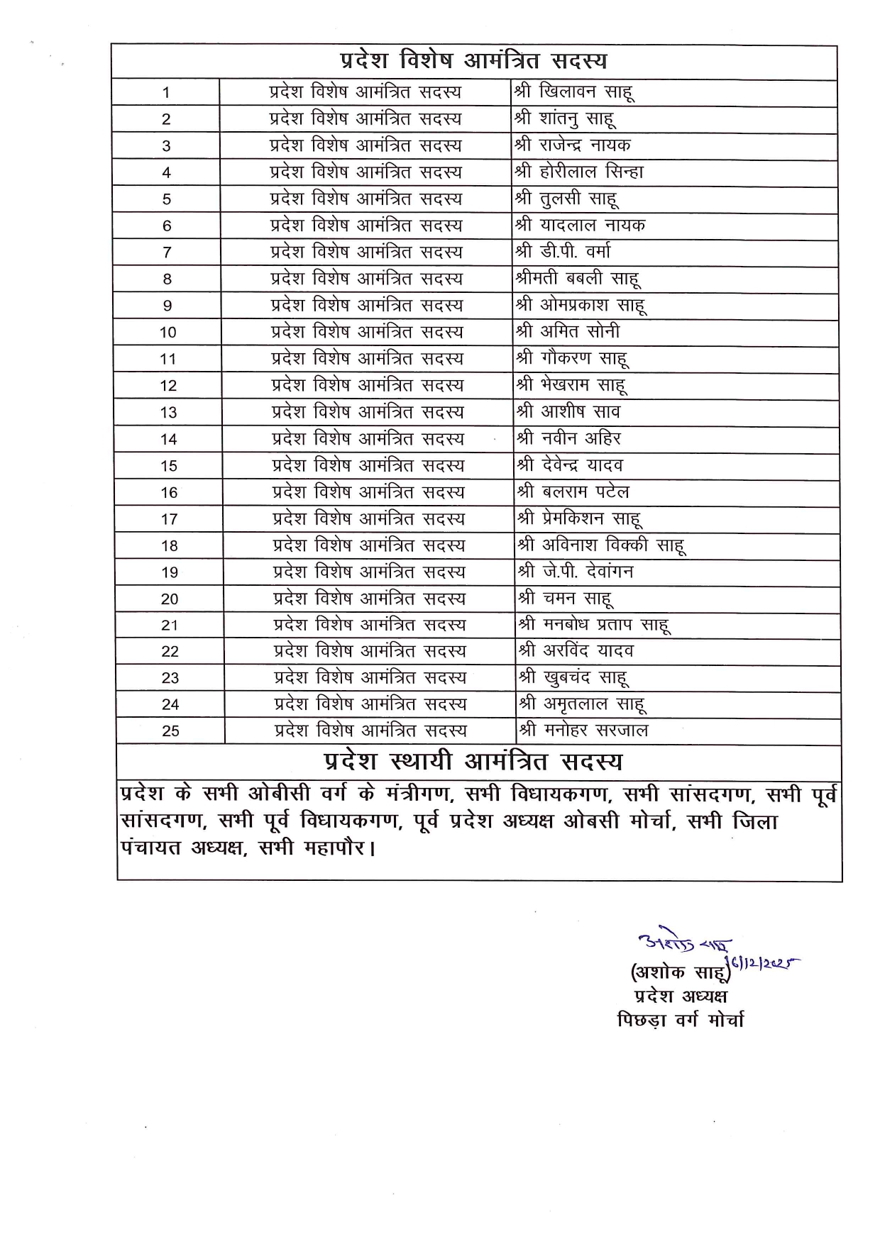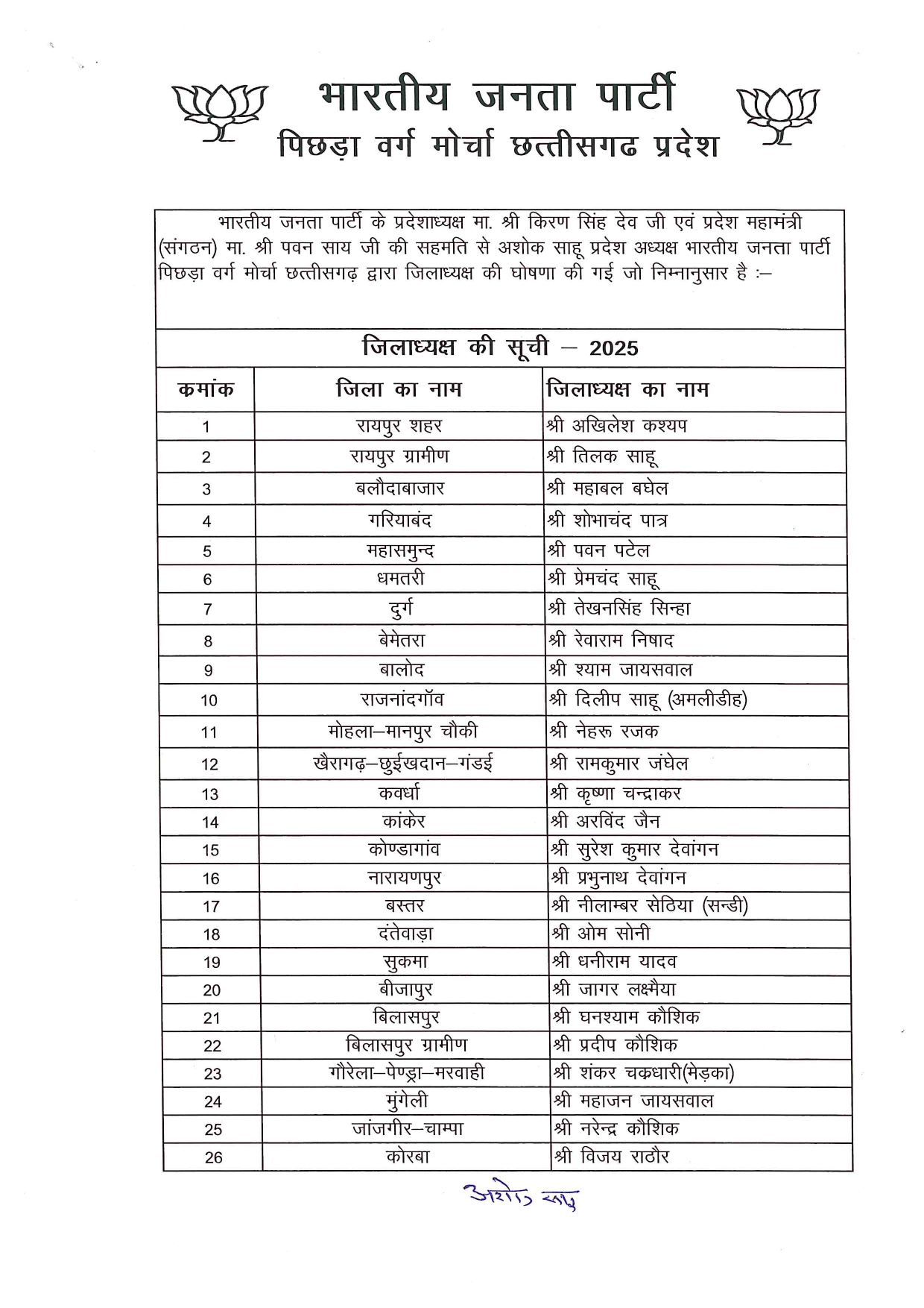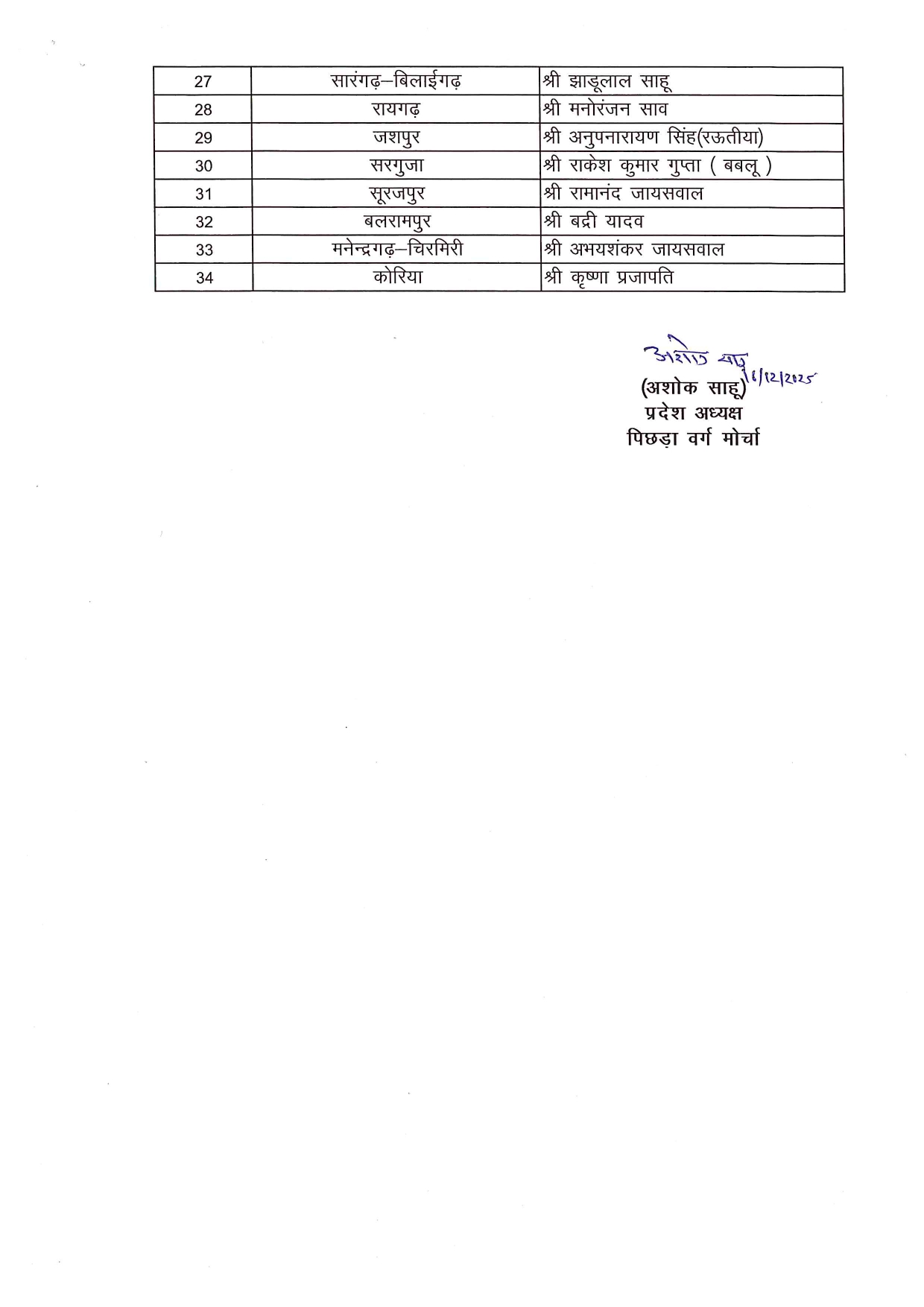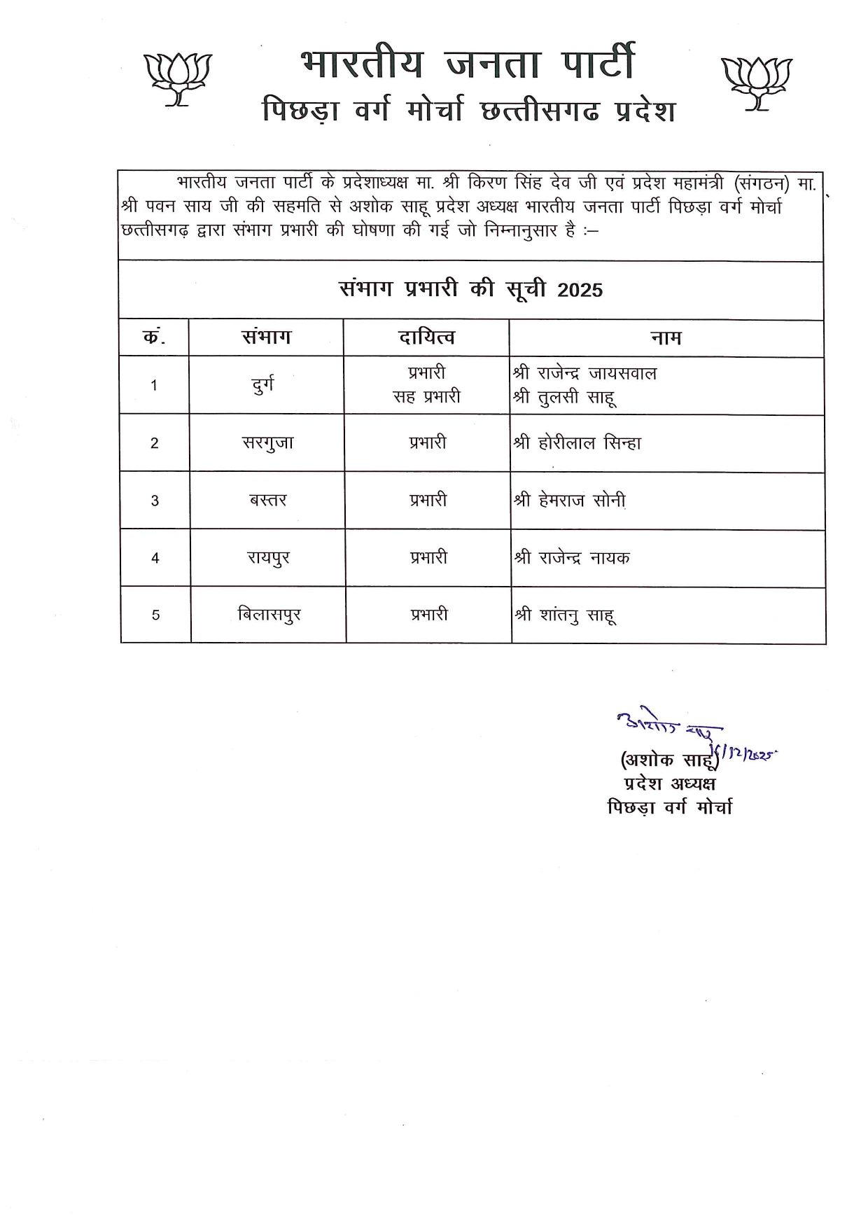 रायपुर, 16 दिसंबर । प्रदेश भाजपा ओबीसी मोर्चा के अध्यक्ष अशोक साहू ने प्रदेश पदाधिकारियों की नियुक्ति कर दी है। इनमें 29 पदाधिकारी, 69 कार्यकारिणी सदस्य,25 विशेष आमंत्रित सदस्य,34 जिला अध्यक्ष शामिल हैं। इनके अलावा 5 संगठन के संभाग प्रभारी भी नियुक्त किए गए हैं।
