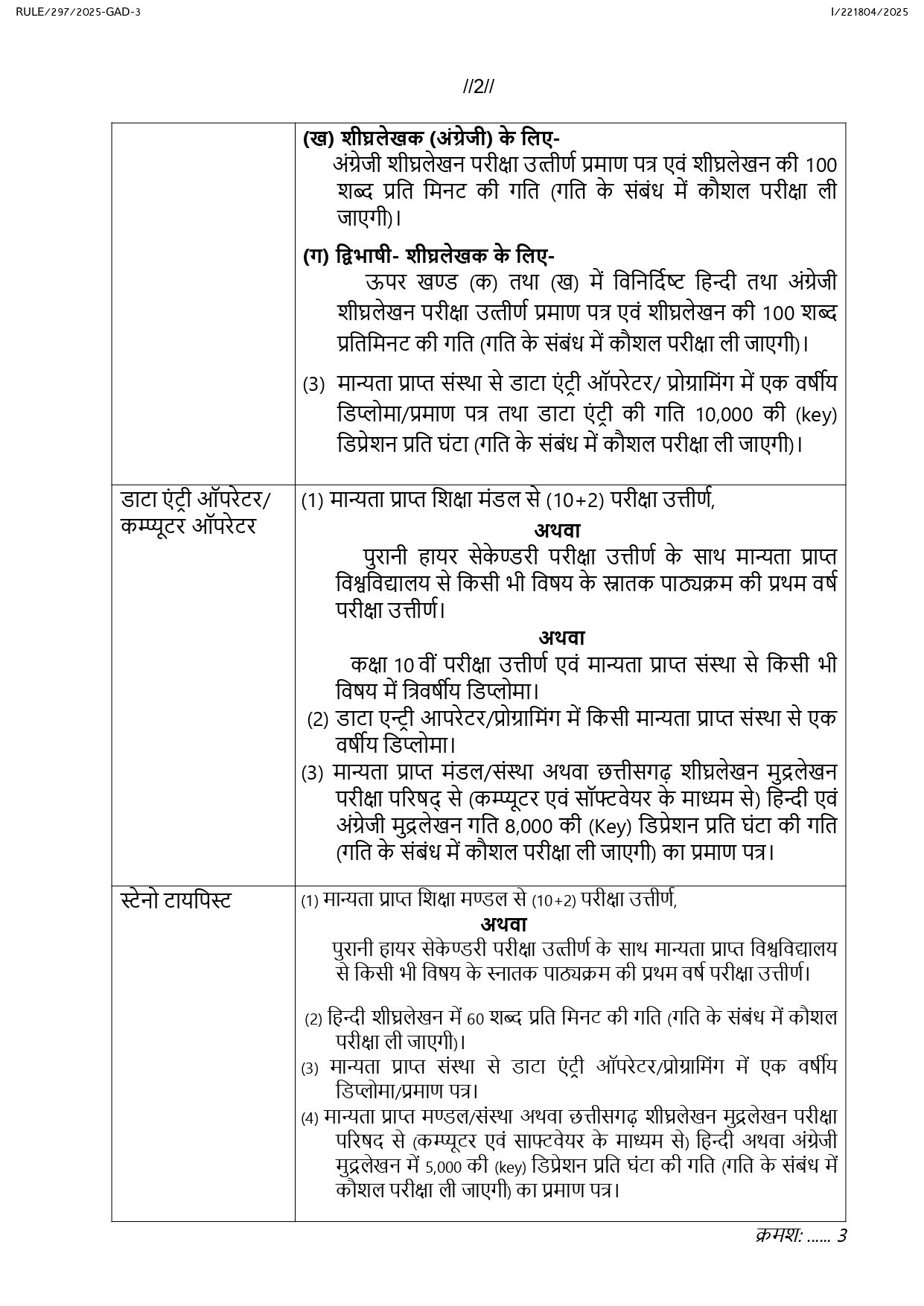 शीघ्रलेखक,डाटा एंट्री/कंप्यूटर आपरेटर, सहायक ग्रेड भर्ती शैक्षिक अर्हताएं बदलीं