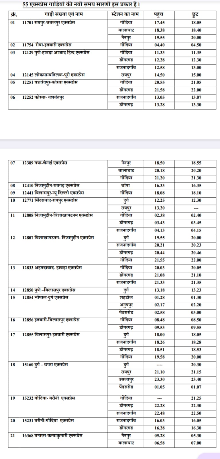 55 एक्सप्रेस गाड़ियों की नयी समय सारणी इस प्रकार है;-