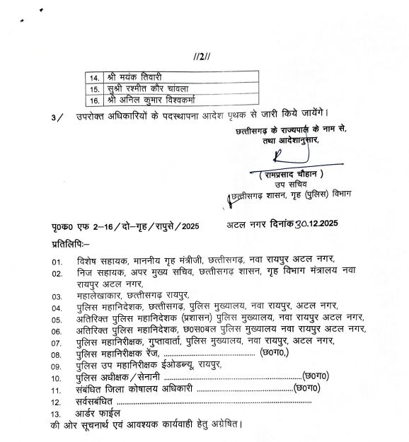 मुख्यमंत्री विष्णुदेव साय की अनुशंसा पर तथा उपमुख्यमंत्री एवं गृह मंत्री विजय शर्मा की विशेष पहल से राज्य पुलिस सेवा के अधिकारियों को वर्ष के अंतिम दिन एक महत्वपूर्ण सौगात मिली है। छत्तीसगढ़ शासन के गृह (पुलिस) विभाग द्वारा जारी आदेश के तहत पुलिस अधिकारियों के हित में यह निर्णय लिया गया है, जिसे पुलिस महकमे में उत्साहवर्धक कदम माना जा रहा है।
