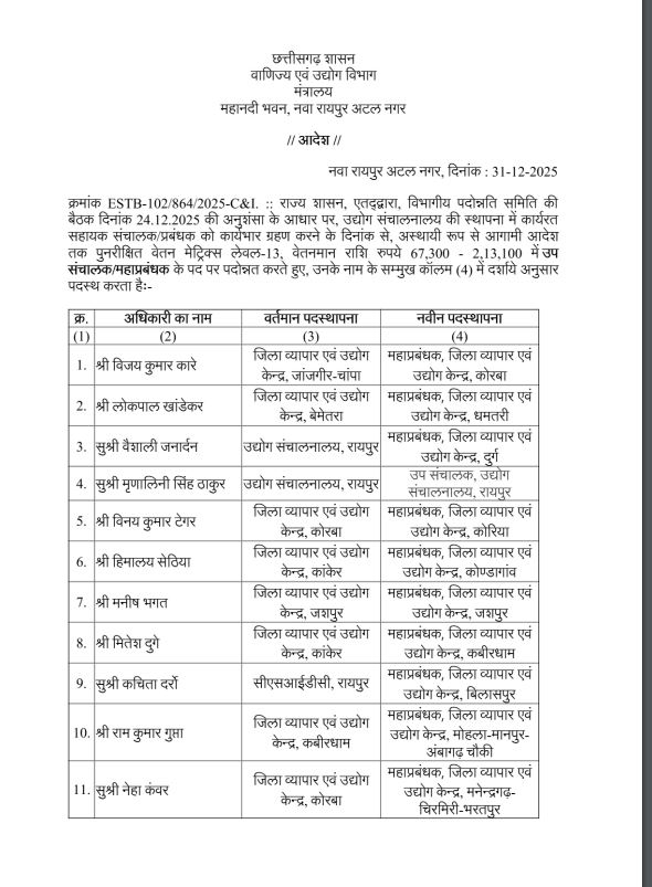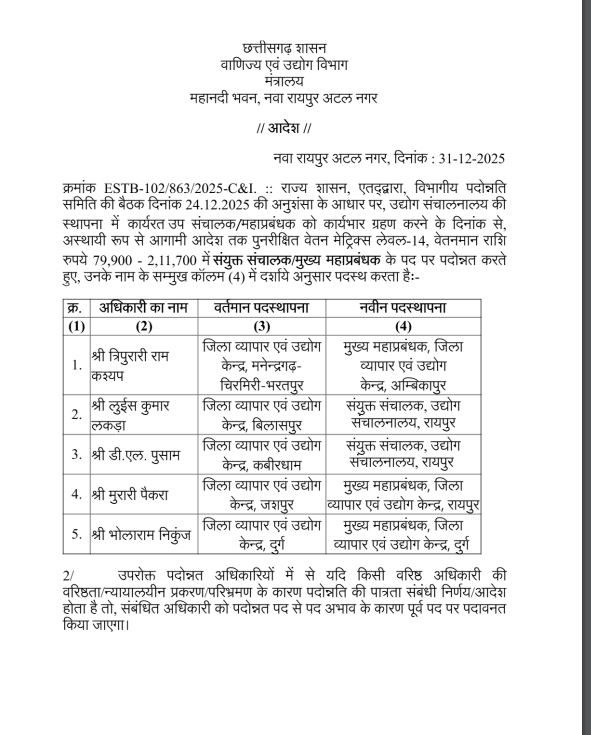 रायपुर, 1 जनवरी । वाणिज्य उद्योग विभाग ने 18 अधिकारियों को पदोन्नति दी है। इनमें 2 अपर संचालक, 5 संयुक्त संचालक और 11 उप संचालक शामिल हैं। संयुक्त और उप संचालकों के तबादले भी किए गए हैं।