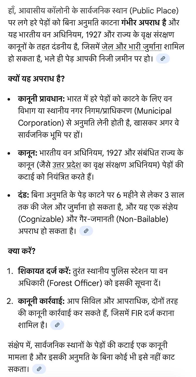 इन पेड़ों से आसपास के घरों को अगर खतरा महसूस हो रहा था तो टहनियों को छँटवा सकते थे। लेकिन पूरे पेड़ ही काट दिए गए। अब बहुतेरे पक्षी, जीव, जंतुओं का आश्रय खत्म हो गया।।