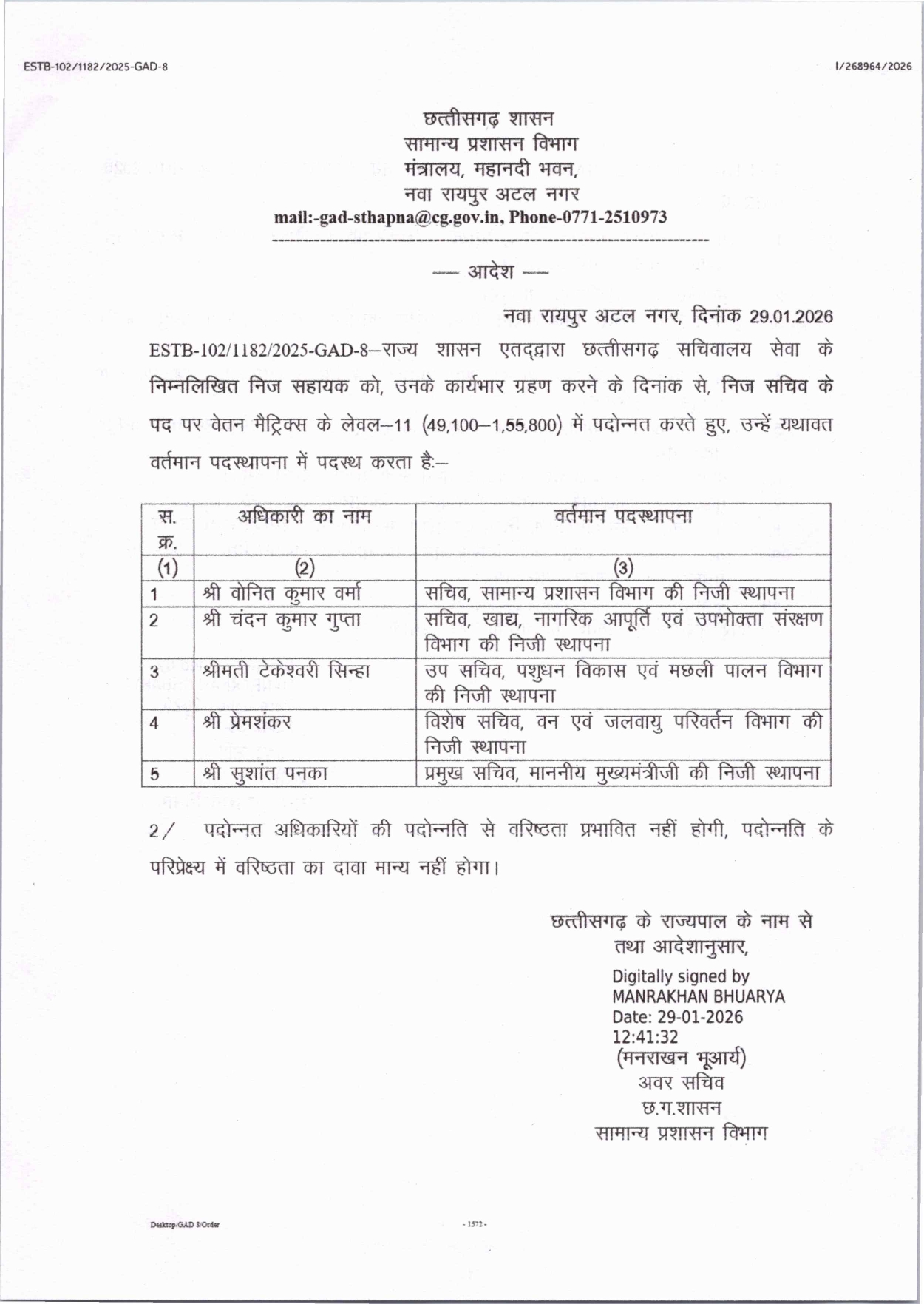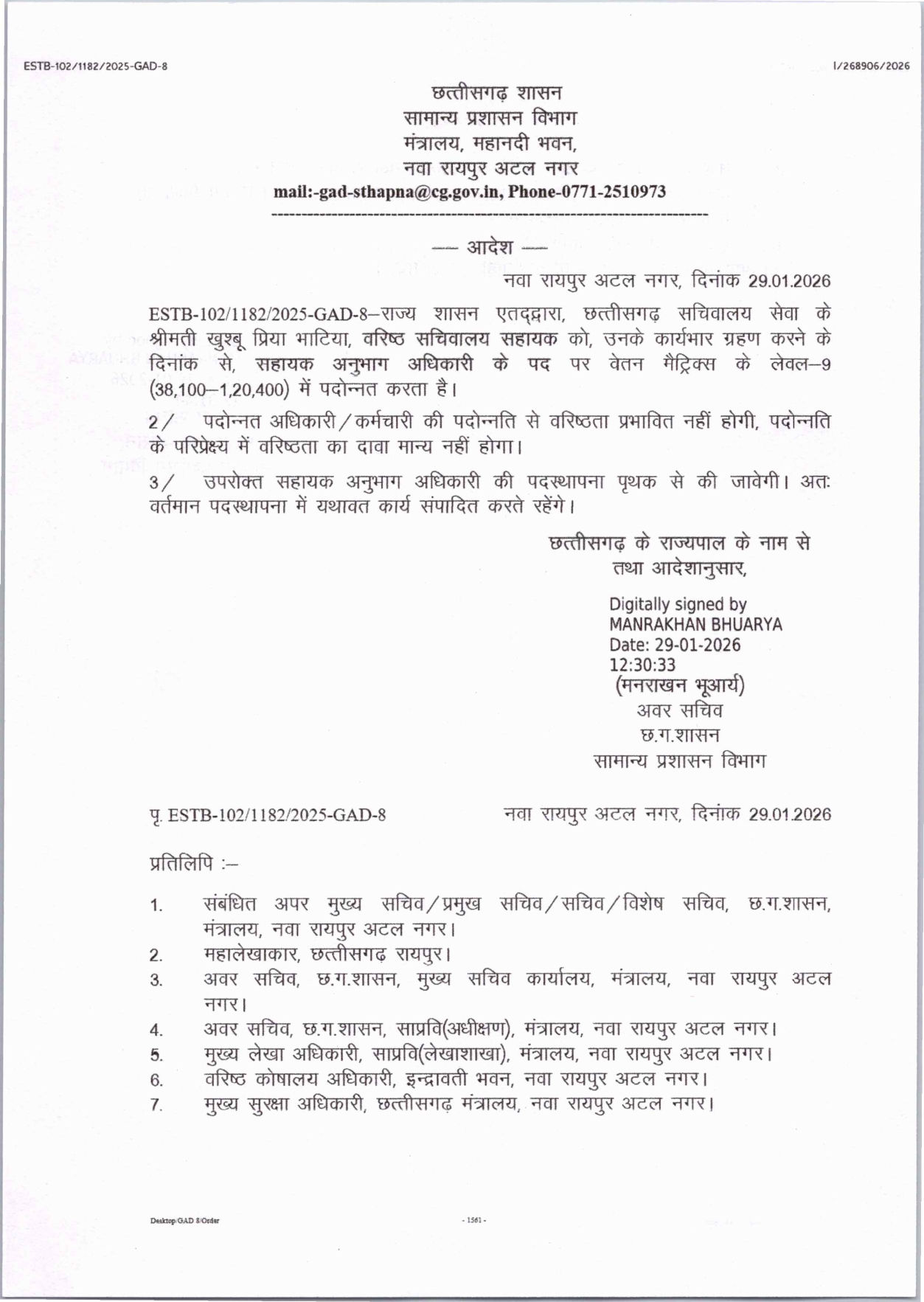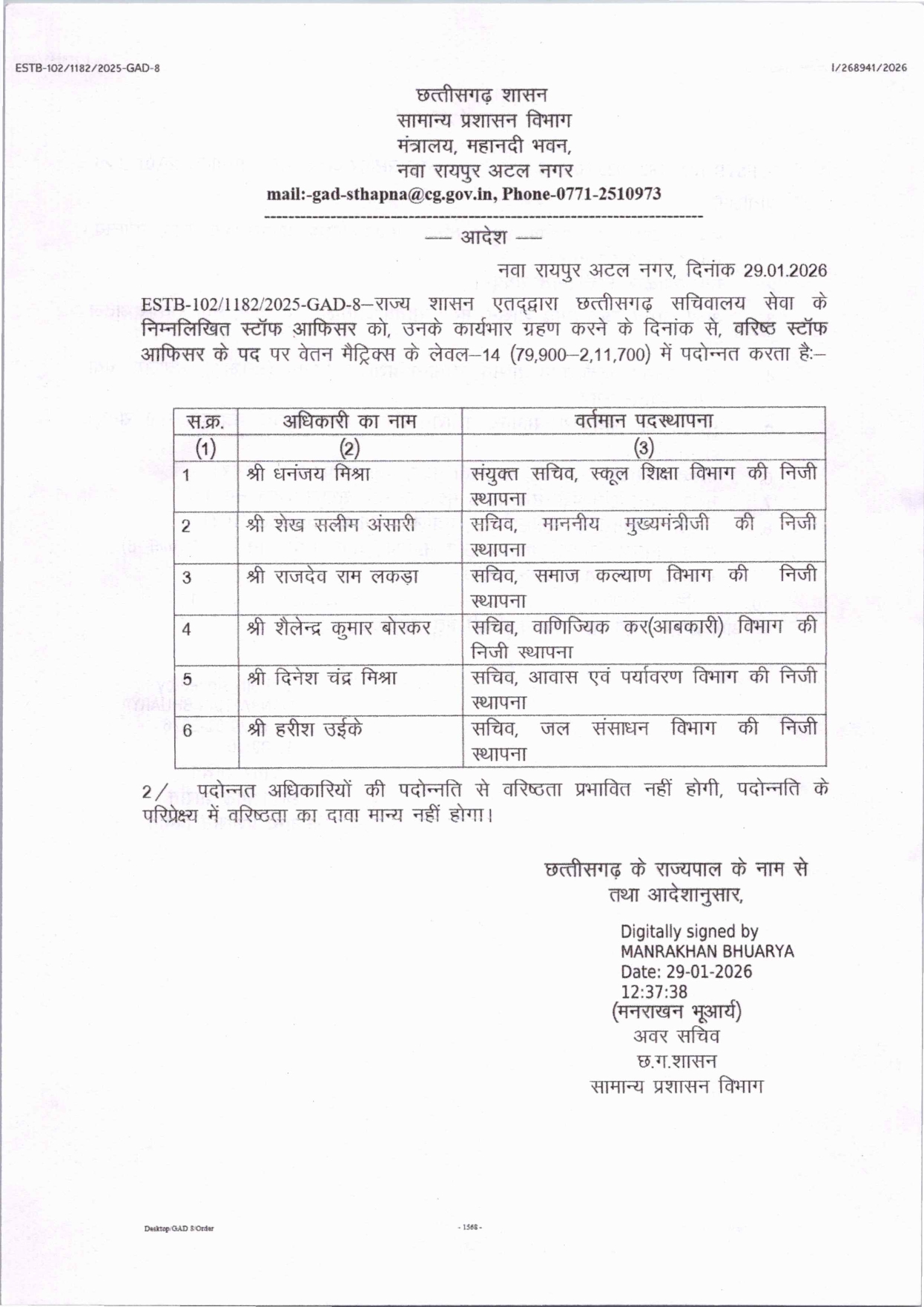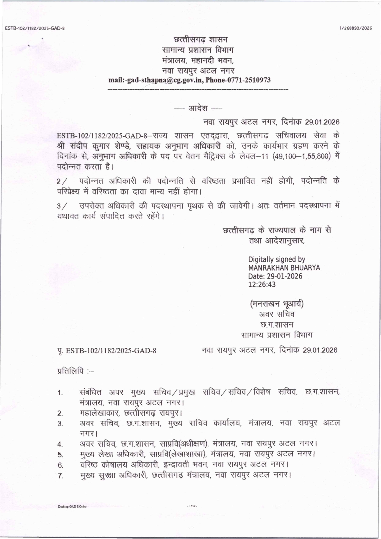 साप्रवि ने मंत्रालय संवर्ग के 45 अधिकारी कर्मचारियों को पदोन्नति दी है। इनमें एक उप सचिव,6 वरिष्ठ स्टाफ आफिसर,25 वरिष्ठ सचिवालय सहायक शामिल हैं।