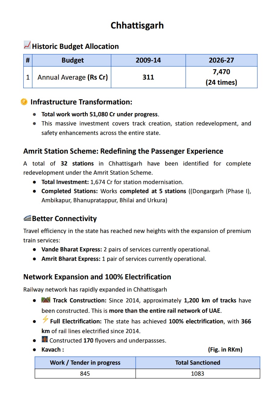 छत्तीसगढ़ राज्य को आवंटित रेल बजट में निम्न अनुसार है