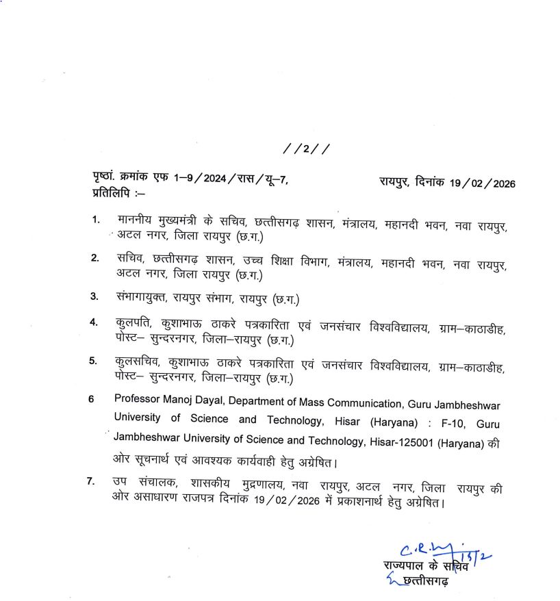 रायपुर,19 फरवरी। हरियाणा के हिसार विश्वविद्यालय के प्रोफेसर मनोज दयाल को कुशाभाऊ ठाकरे पत्रकारिता विश्वविद्यालय का कुलपति नियुक्त किया गया है।