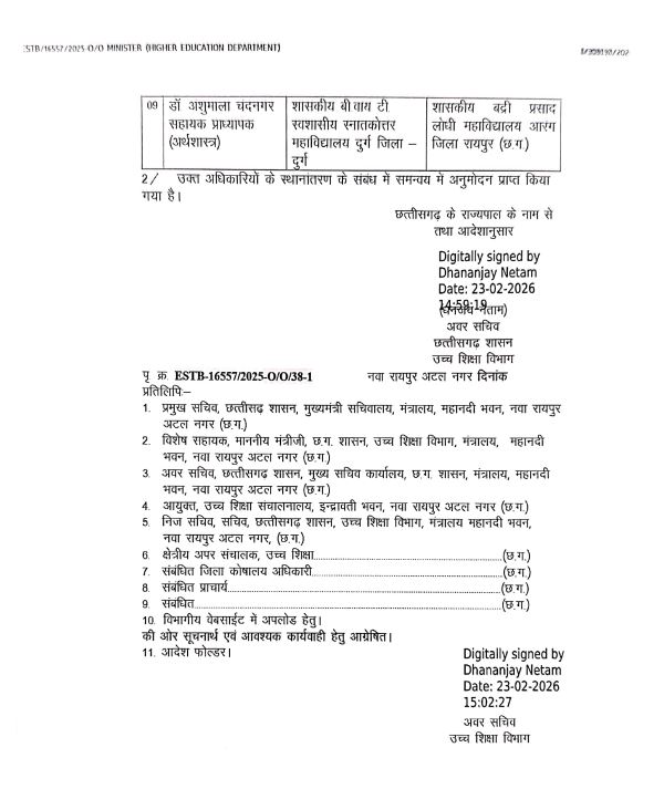 रायपुर, 23 फरवरी । उच्च शिक्षा विभाग ने 5 प्राचार्य और 4 सहायक प्रोफेसरों के तबादले किए हैं। देखें आदेश ---
