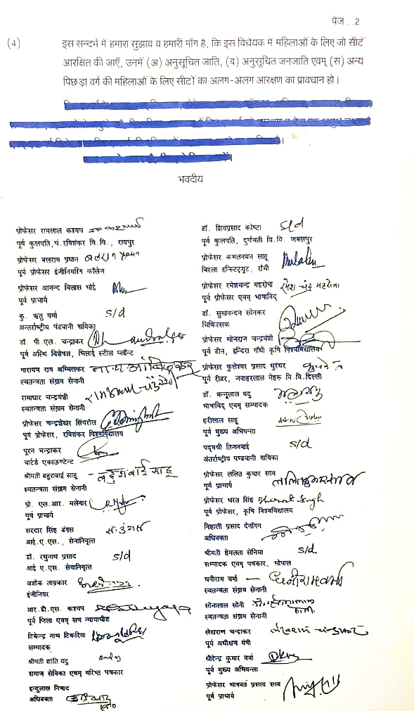 रायपुर, 16 अप्रैल। महिला आरक्षण बिल पर संसद में बहस चल रही है। खास बात ये है कि 28 साल पहले अविभाजित मध्यप्रदेश में छत्तीसगढ़ के बुद्धिजीवियों से महिला आरक्षण में पिछड़ा वर्ग की भागीदारी की मांग रखी थी। इस सिलसिले में तत्कालीन प्रधानमंत्री अटल बिहारी वाजपेई को पत्र भी लिखा था।