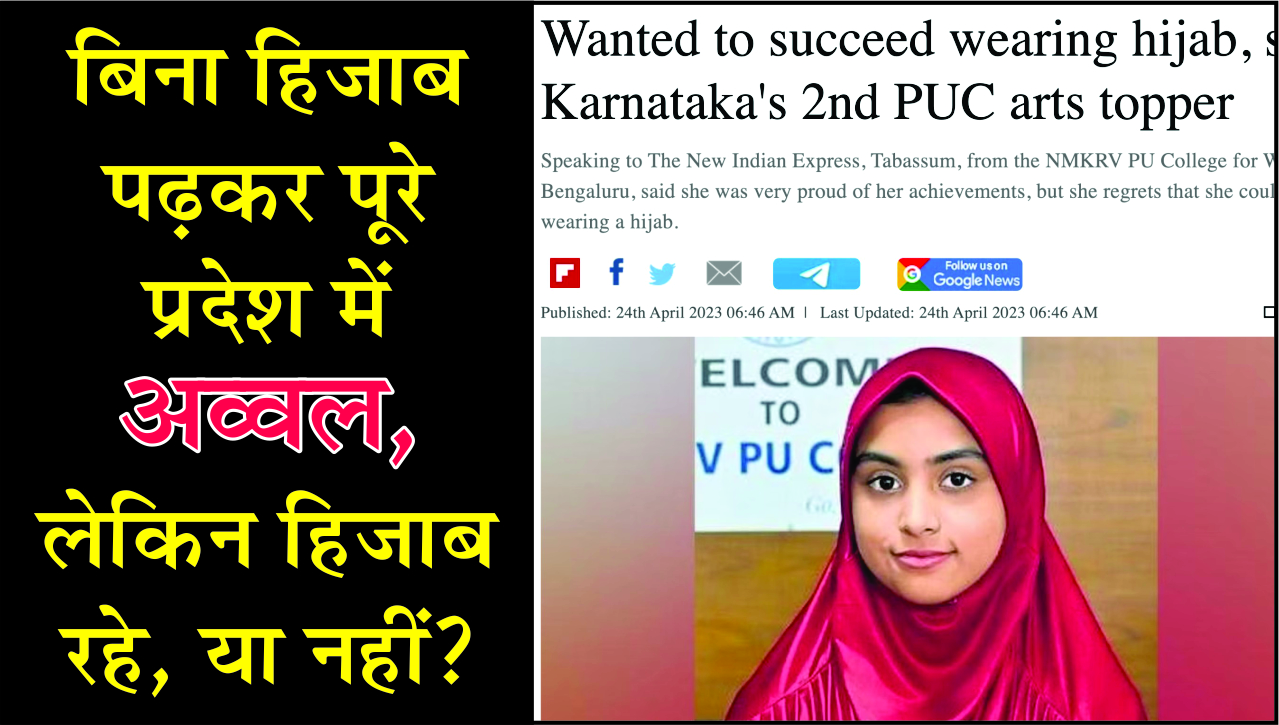 एक फेसबुक पोस्ट में लिखा है, यह तबस्सुम शेख है। इसने कर्नाटक में उड़ीपी के कॉलेज में हिजाब को पहनने के लिए विद्रोह किया और इसे हिजाब के कारण क्लास से बाहर कर दिया गया था। उसी तबस्सुम शेख ने इंटरमीडिएट में 98.3 प्रतिशत हासिल कर कर्नाटक की टॉपर बन गई है।