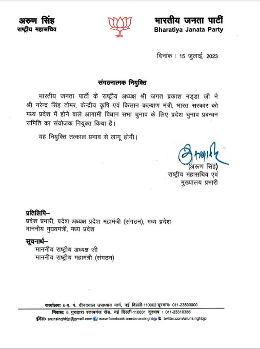 नयी दिल्ली, 15 जुलाई भारतीय जनता पार्टी (भाजपा) ने मध्य प्रदेश में आगामी विधानसभा चुनाव के लिए केंद्रीय मंत्री नरेन्द्र सिंह तोमर को शनिवार को अपनी चुनाव प्रबंधन समिति का संयोजक नियुक्त किया।