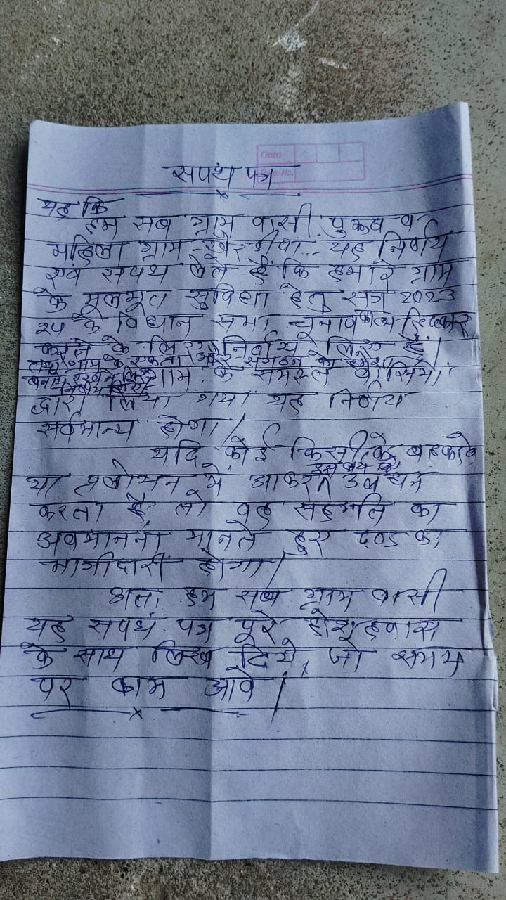 गांव के ग्रामीणों ने एक शपथ पत्र भी तैयार किया है, जिसमें उन्होंने कहा है कि हम सभी खैरडीपा निवासी यह शपथ लेते हैं कि हमारे ग्राम के मूलभूत सुविधा हेतु 2023-24 विधानसभा चुनाव का बहिष्कार करने का निर्णय लिया है, तथा गांव के एकता और संगठन को बनाये रखने के लिए ग्राम के समस्तवासियों द्वारा निर्णय लिया गया है। यह निर्णय सर्वमान्य होगा। यदि कोई किसी के बहकावें या प्रलोभन में आकर इस वर्ष उल्लंघन करता है तो वह दण्ड का भागीदार होगा। अत: हम सब ग्रामवासी यह शपथ पत्र पूरे होश हवास के साथ लिखे हैं, जो समय पर काम आए।