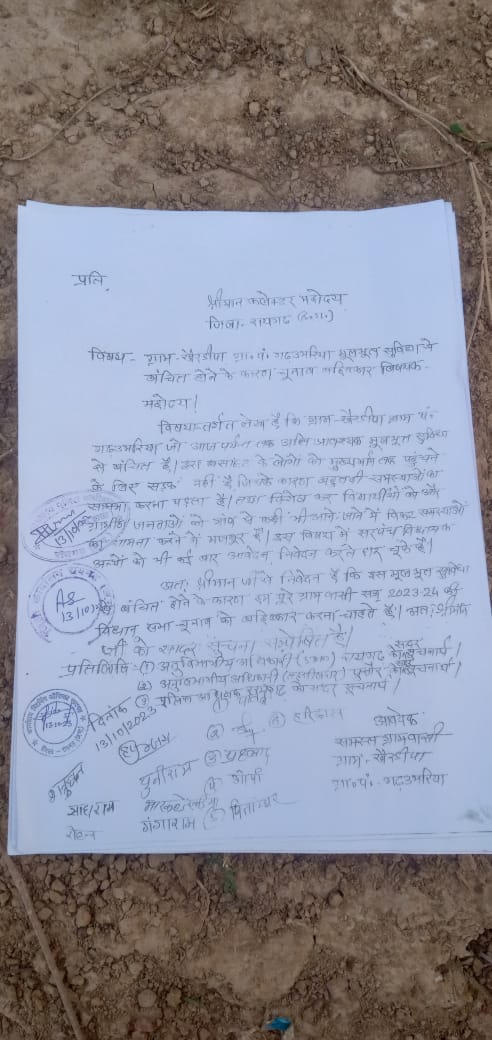 गांव के ग्रामीणों ने कलेक्टर रायगढ़ के नाम लिखे गए ज्ञापन पत्र में कहा है कि कई बार शिकायत करने के बावजूद आज पर्यंत तक उन्हें मूलभूत समस्याओं से जूझना पड़ रहा है। इस गांव के लोगों के लिए मुख्यमार्ग तक पहुंचने सडक़ नहीं है, जिसके कारण उन्हें कई प्रकार की समस्याओं का सामना करना पड़ता है। गांव के ग्रामीणों ने अपनी इस समस्या से सरपंच से लेकर अन्य नेताओं को कई बार अवगत करा चुके हैं, इसके बावजूद उनकी समस्याओं को हमेशा ही दरकिनार किया गया है।