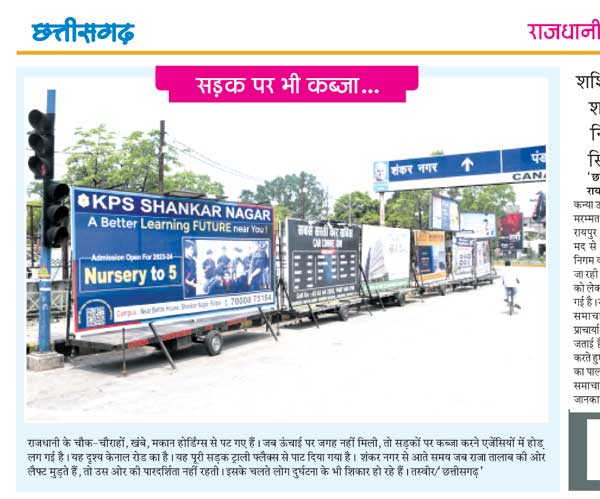 रायपुर, 26 अप्रैल। शहर के विभिन्न संस्थान अपने प्रचार - प्रसार के लिए अवैध रूप से सडक़ पर मोबाइल विज्ञापन ट्रालियों को लगाकर यातायात को बाधित करते हैं। कल दैनिक छत्तीसगढ़ ने केनाल रोड पर राजातालाब मोड़ सडक़ पर आधा दर्जन विग्यापन ट्राली खड़े कर दिए गए थे। इससे हजारों लोगो की आवाजाही बाधित और दूसरी तरफ कि दृश्यता न होने से टकराने की आशंका बनी हुई थी। आयुक्त मयंक चतुर्वेदी ने शहर के विभिन्न मार्गो का प्रत्यक्ष निरीक्षण कर नगर निवेश उडऩ दस्ते को कार्रवाई करने कहा। इससे सम्बंधित शिकायत मौके पर सही पायी गयी.।इस पर आज निगम के उडऩ दस्ते ने शहर के विभिन्न मुख्य मार्गो में अभियान चलाकर इन मोबाइल ट्रालियों को जब्त किया। इससे शहर के मुख्य मार्गो में यातायात सुगम हो जाने से वाहन चालकों एवं आमजनों को त्वरित राहत मिली।मुख्य मार्गो को कब्जामुक्त बनाने नगर निवेश उडऩ दस्ते का यह अभियान जारी रहेगा।