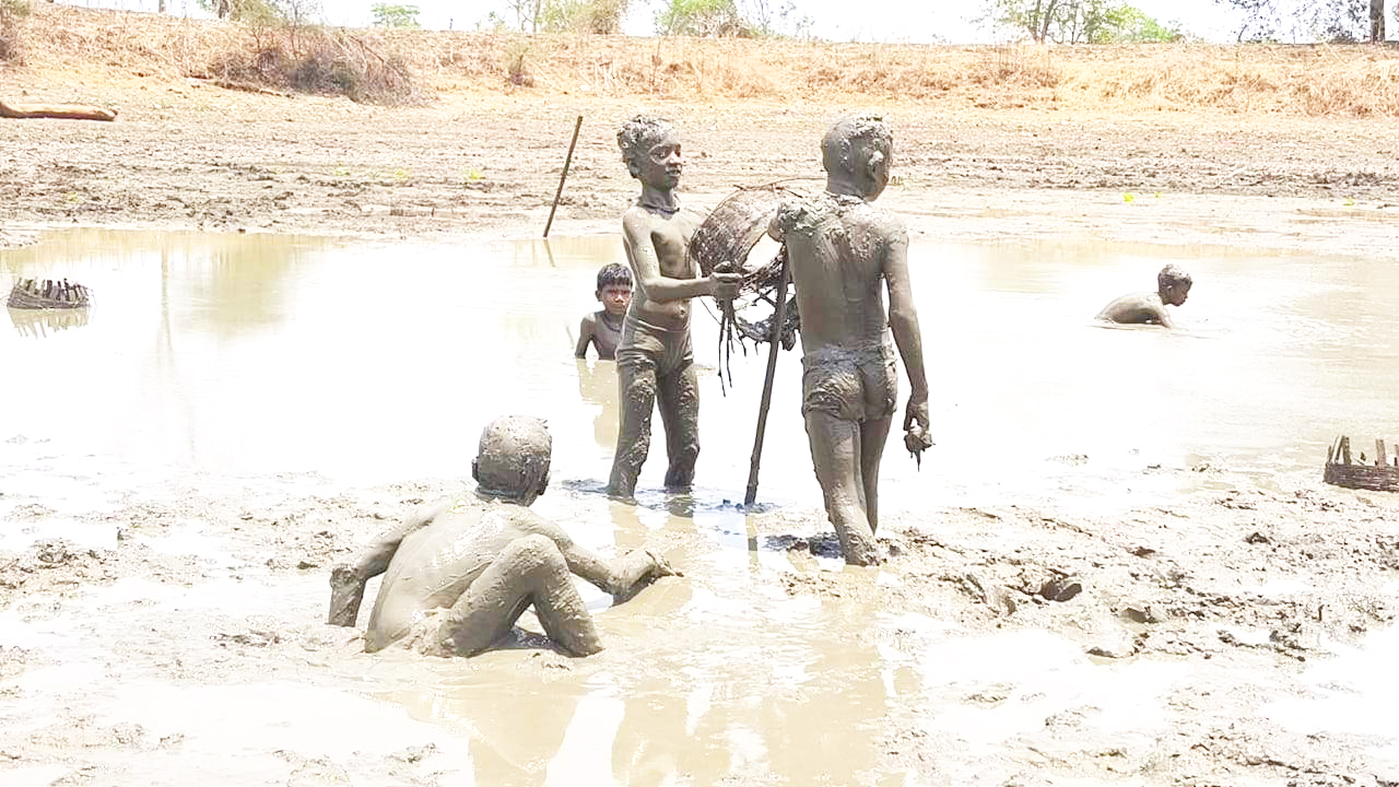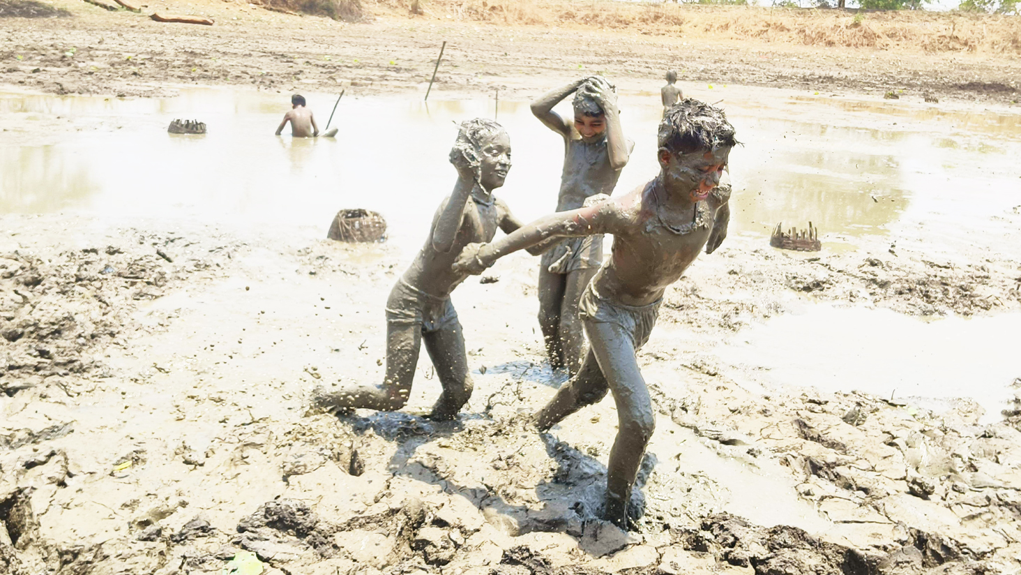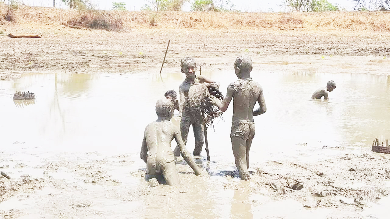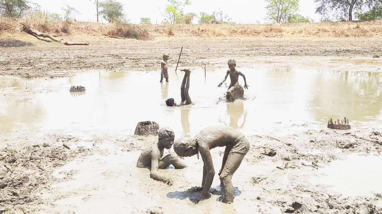 सूरज की तपिश से बचने तालाब की कीचड़ से खेलते बच्चे