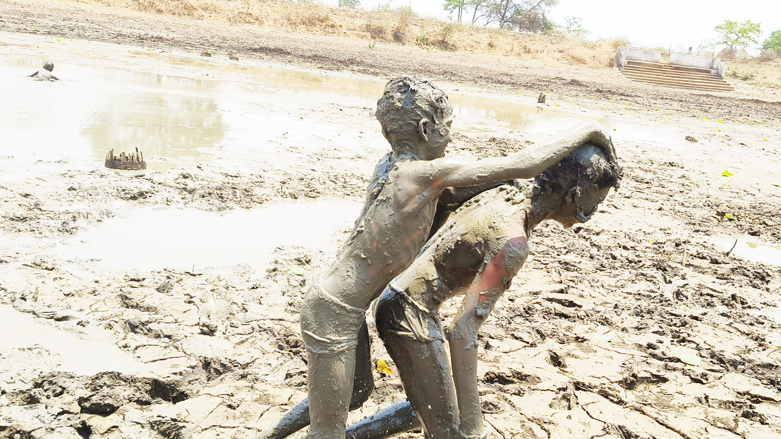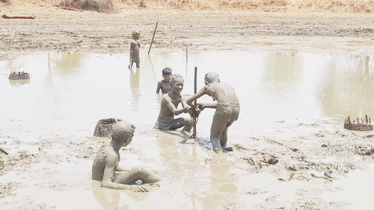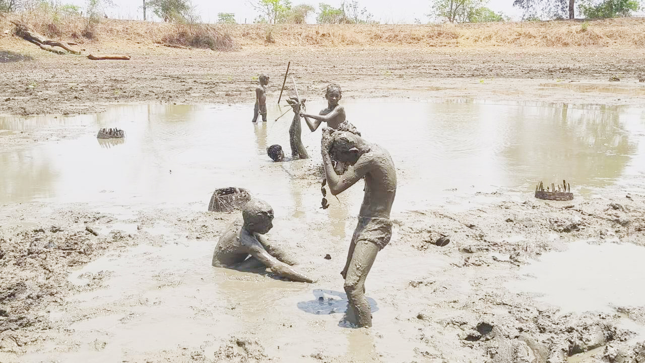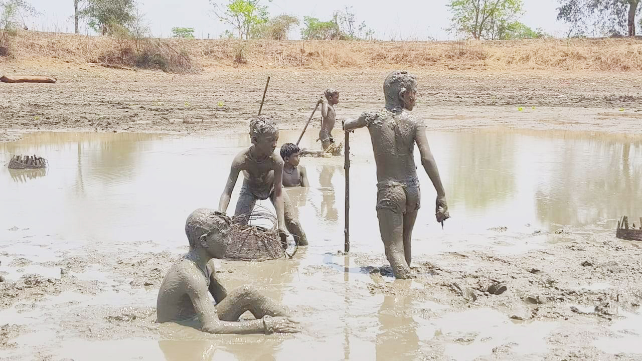 सूरज की तपिश से बचने तालाब की कीचड़ से खेलते बच्चे
