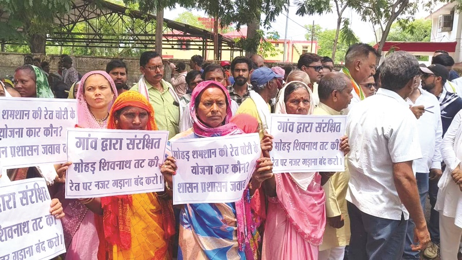 आईजी अभिषेक शांडिल्य को ज्ञापन सौंपने वार्डवासियों व कांग्रेसियों के साथ वार्ड की महिलाएं हाथों में तख्तियां लेकर शामिल हुई। महिलाओं ने मोहड़ शमशान की रेत चोरी की योजनाकार कौन? प्रशासन जवाब दे, गांव द्वारा संरक्षित मोहड़ शिवनाथ तट की रेत पर नजर गड़ाना बंद करें, की तख्ती लेकर  शामिल हुई।