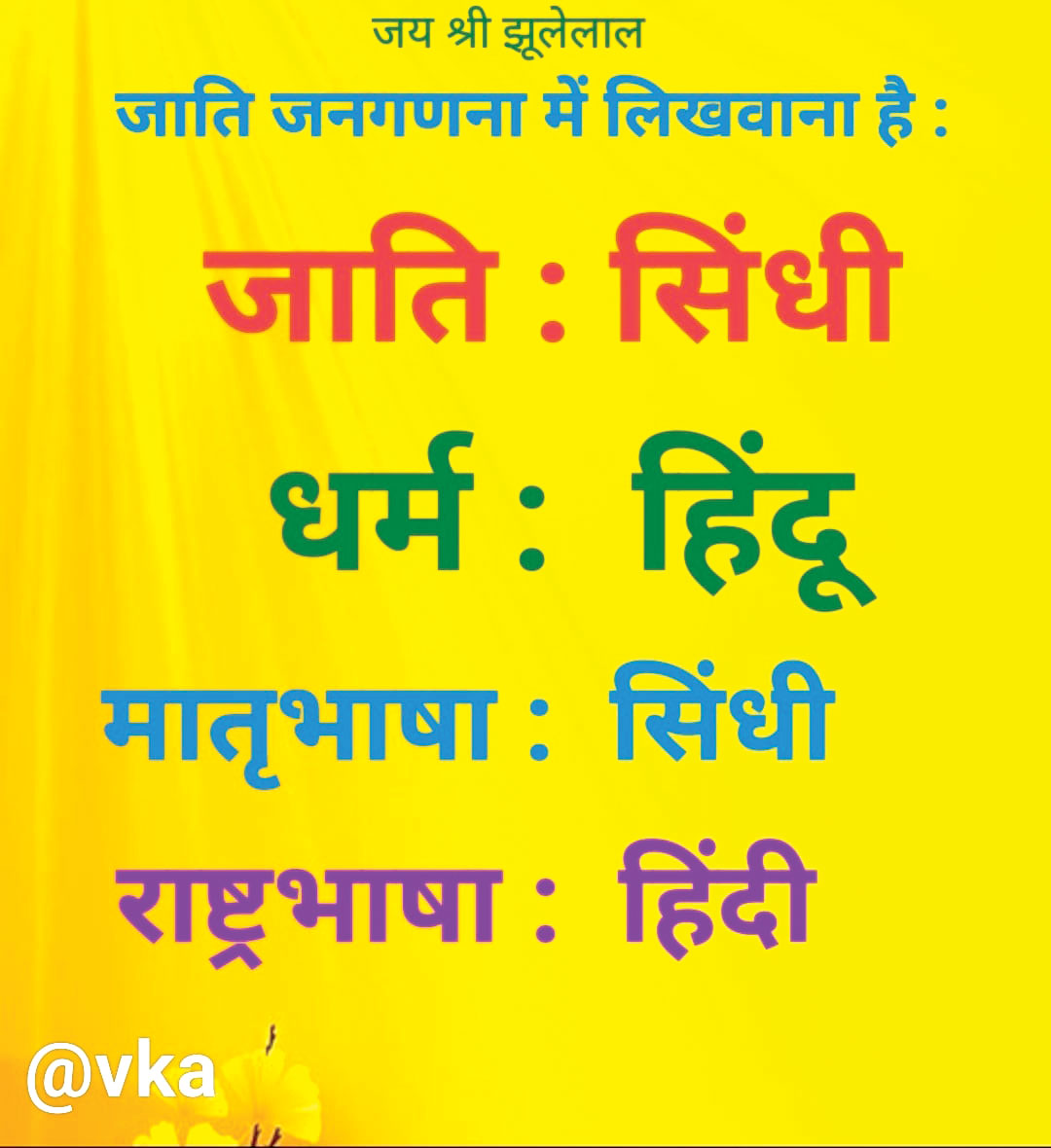 मसलन, सिंधी समाज के प्रमुख लोगों ने सोशल मीडिया के माध्यम से अभियान चलाया कि जाति जनगणना में क्या लिखवाना है। जाति का नाम-सिंधी, धर्म-हिन्दू, मातृभाषा-सिंधी, राष्ट्रभाषा-हिन्दी, यह कॉलम में दर्ज कराने के लिए जागरूक किया जा रहा है। सिंधी समाज के लोग पाकिस्तान के सिंध प्रांत के रहने वाले हैं, और ज्यादातर बंटवारे के बाद भारत आए। यहां अलग-अलग प्रांतों में निवासरत हैं। जबकि पाकिस्तान के सिंध के अलग-अलग इलाकों के नाम से उनकी जातियां रही है जैसे-लारकाना, कंधकोटी, शिकारपुरी, सखर, साहित्य, पन्ने, और हैदराबादी आदि हैं। मगर यहां आने के बाद उनमें जाति भेद नहीं रहा, और वो सिंधी कहलाते हैं, और यही उनकी पहचान भी है।