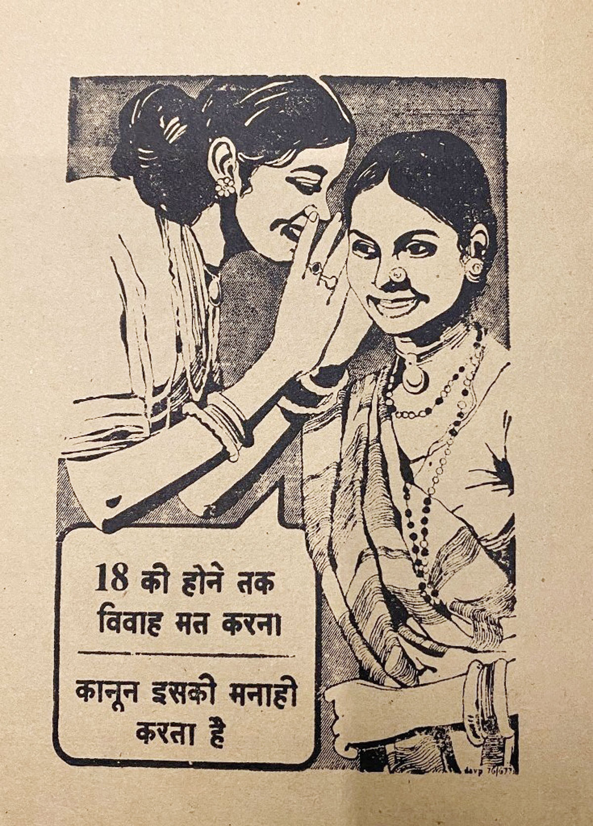 यह तस्वीर ‘पहल’ के मार्च 1977 के अंक के अंदरूनी कवर पेज पर छपा एक सरकारी विज्ञापन है। यह वह दौर था, जब सरकारी संदेश सादगी, संवेदना और सीधे संवाद के साथ जनता तक पहुँचते थे। नारे छोटे होते थे, लेकिन अर्थ गहरे। इस पोस्टर में बाल विवाह के खिलाफ संदेश साफ है। मां अपनी नाबालिग बेटी के कान में काम की बात बता रही है। 18 की होने तक विवाह मत करना, कानून इसकी मनाही करता है।