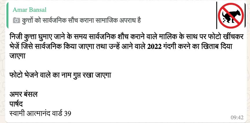कुत्ते पालने के शौकीन लोग रोज सुबह-शाम कुत्तों को खाना खिलाने के बाद उन्हें पखाना करवाने बाहर ले जाते हैं और सडक़ पर या दूसरे लोगों के घरों के सामने उन्हें पखाना करवा कर वापिस ले आते हैं। नतीजा यह होता है कि जब लोग अपने घर के सामने गाड़ी रोकते हैं तो वहां गंदगी बिखरी हुई रहती है और अगर ध्यान ना रहा तो जूतों के साथ वह  घर के भीतर भी चली जाती है। हिंदुस्तान के कुछ अधिक असभ्य शहरों में म्युनिसिपल ऐसे लोगों पर जुर्माना लगाती है लेकिन छत्तीसगढ़ इस किस्म की सामाजिक जागरूकता से मुक्त है। ऐसे में रायपुर के एक मेहनती वार्ड मेंबर अमर बंसल ने समता कॉलोनी, चौबे कॉलोनी जैसे अपने वार्ड के इलाकों में ऐसे कुत्ता मालिकों के लिए एक किस्म से एक चेतावनी जारी की है और इसमें लोगों से भागीदारी की उम्मीद भी की है कि लोग ऐसे कुत्ता मालिकों की फोटो भेजें ताकि उन्हें उजागर किया जा सके। और घंटे भर के भीतर ही ऐसे एक कुत्ता मालिक के नाम के साथ शिकायत आ भी गई है। ऐसी जागरूकता अगर काम करे तो कुत्ते घुमाने के शौकीन लोग उनका पखाना उठाने की आसान सी चीज लेकर चलेंगे और एक सामाजिक जिम्मेदारी आएगी।