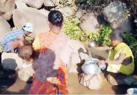 यह तस्वीर बलरामपुर जिले के सनमंदरा गांव की है। यहां के निवासी दूर के स्रोतों से प्राकृतिक नाले का पानी लाते हैं। गांव में हैंडपंप या कुआं नहीं है। वे दूषित पानी पीने को मजबूर हैं। गांव में पक्की सडक़ भी नहीं है।