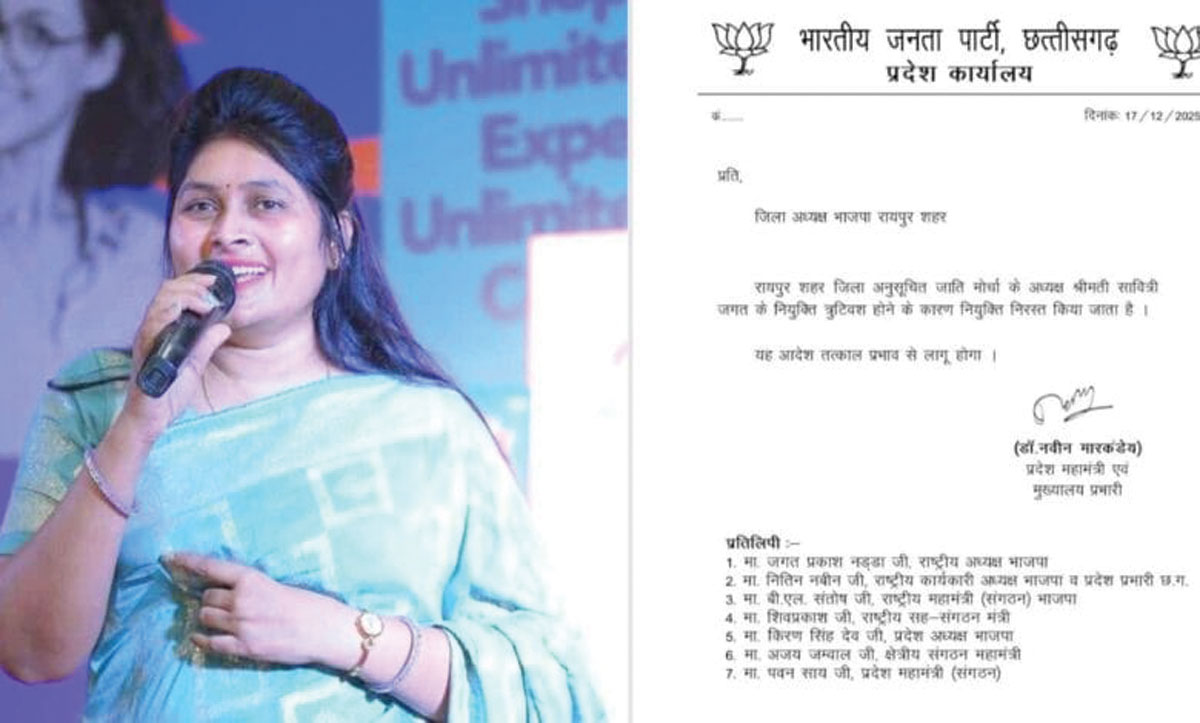 राजनीतिक दलों में कई नियुक्तियां ऐसी हो जाती है जिससे पार्टी संगठन पशोपेश में पड़ जाता है, और सफाई देते नहीं बनता है। कुछ ऐसी ही नियुक्ति भाजपा में हो गई। भाजपा पदाधिकारियों की सूची जारी हुई, तो रायपुर एससी महिला मोर्चा की अध्यक्ष पद पर सावित्री जगत की नियुक्ति कर दी गई। थोड़ी देर बाद पार्टी ने प्रेसनोट जारी किया, और स्पष्ट किया कि सावित्री जगत की नियुक्ति आदेश त्रुटिपूर्ण है। नई नियुक्ति जल्द की जाएगी।