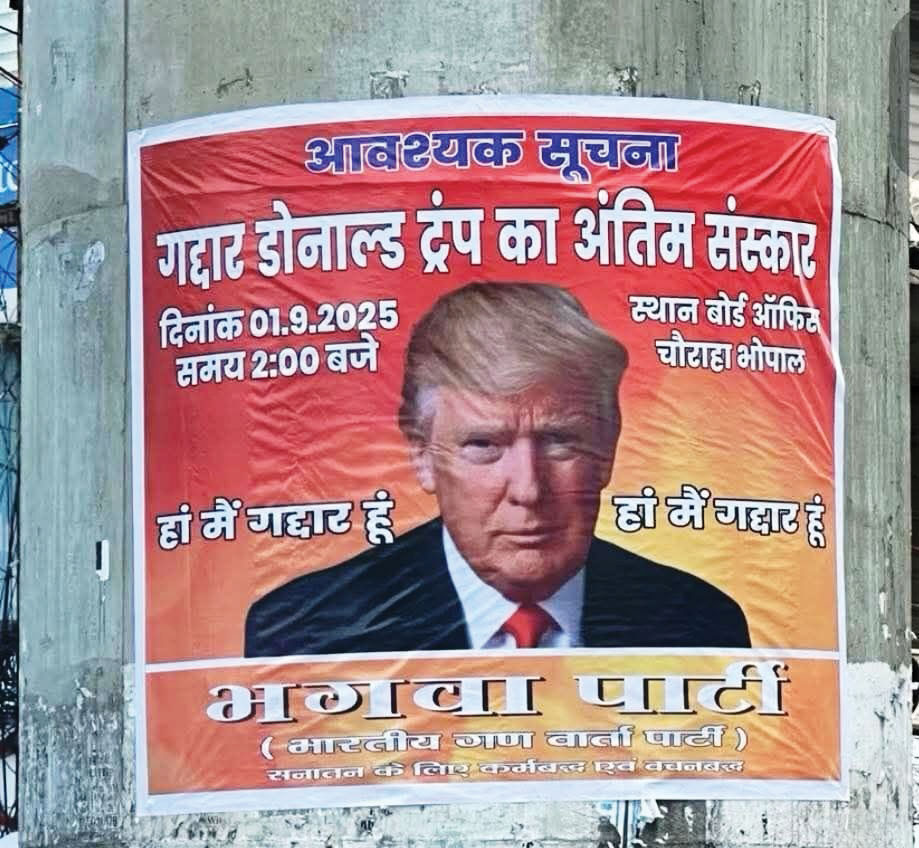 इसी अपने देश में अमेरिकी राष्ट्रपति के नाम पर घी के दीपक जलाए गए, उनकी जीत की कामना के लिए हवन हुए। संदेश यह दिया गया कि वाशिंगटन से लेकर वाराणसी तक ट्रंप की दोस्ती का नया नाम है। मगर, अब हालत बदल गए हैं। ट्रंप ने भारतीय माल पर मनमाना टैरिफ की तलवार लहरा रखी है। लाखों लोग बेरोजगार हो रहे हैं, सैकड़ों उद्योग धंधे ठप होने जा रहे हैं। ऐसे में यदि किसी सडक़ पर यदि ट्रंप का प्रतीकात्मक अंतिम संस्कार कर दिया जाए तो आश्चर्य क्यों होना चाहिए? जैसा कि पोस्टर से ही स्पष्ट है, यह तस्वीर भोपाल की है।