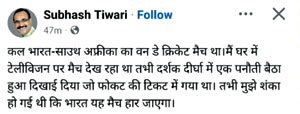राज्य श्रम कल्याण मंडल के पूर्व उपाध्यक्ष, और सीनियर भाजपा नेता सुभाष तिवारी ने फेसबुक पर अपने पोस्ट में लिखा कि कल भारत-दक्षिण अफ्रीका का वनडे क्रिकेट मैच था। मैं घर में टेलीविजन पर मैच देख रहा था। तभी दर्शक दीर्घा में एक पनौती बैठा हुआ दिखाई दिया, जो फोकट की टिकट में गया था। तभी मुझे शंका हो गई थी कि भारत यह मैच हार जाएगा। तिवारी का इशारा किसकी तरफ था, यह तो स्पष्ट नहीं है। मगर मैच देखने सरकार के मंत्री ओपी चौधरी, वन मंत्री केदार कश्यप, श्याम बिहारी जायसवाल, और कैबिनेट मंत्री दर्जा प्राप्त सौरभ सिंह, पूर्व सांसद अभिषेक सिंह सहित पार्टी के कई कद्दावर नेता पहुंचे थे।