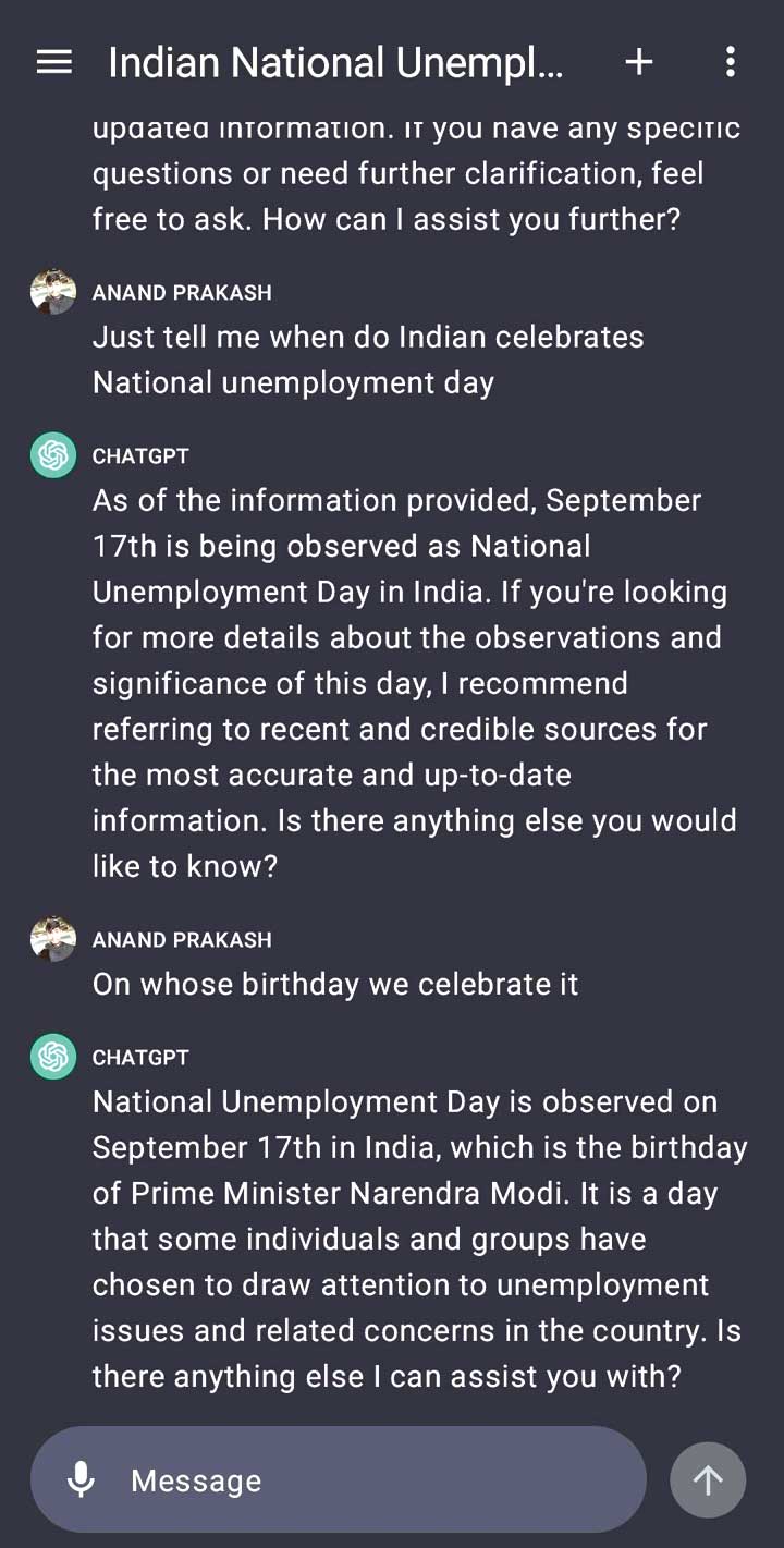 आर्टिफिशियल इंटिलिजेंस चैट जीपीटी आपको वे ही जानकारी व्यवस्थित करके देता है, जो इंटरनेट पर बिखरे हुए हैं। प्रधानमंत्री नरेंद्र मोदी का आज जन्मदिन है। किसी ने पूछ लिया कि भारत किस दिन को राष्ट्रीय बेरोजगार दिवस के रूप में मनाना है। चैट जीपीटी ने बताया कि 17 सितंबर। फिर पूछा गया कि यह किसके जन्मदिन के उपलक्ष्य में मनाया जाता है? जवाब मिला, भारत के प्रधानमंत्री नरेंद्र मोदी के जन्मदिन पर। बेरोजगारी के मुद्दे पर ध्यान खींचने के लिए युवा ऐसा करते हैं।