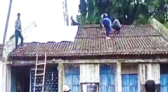 छत की मरम्मत करते छात्र