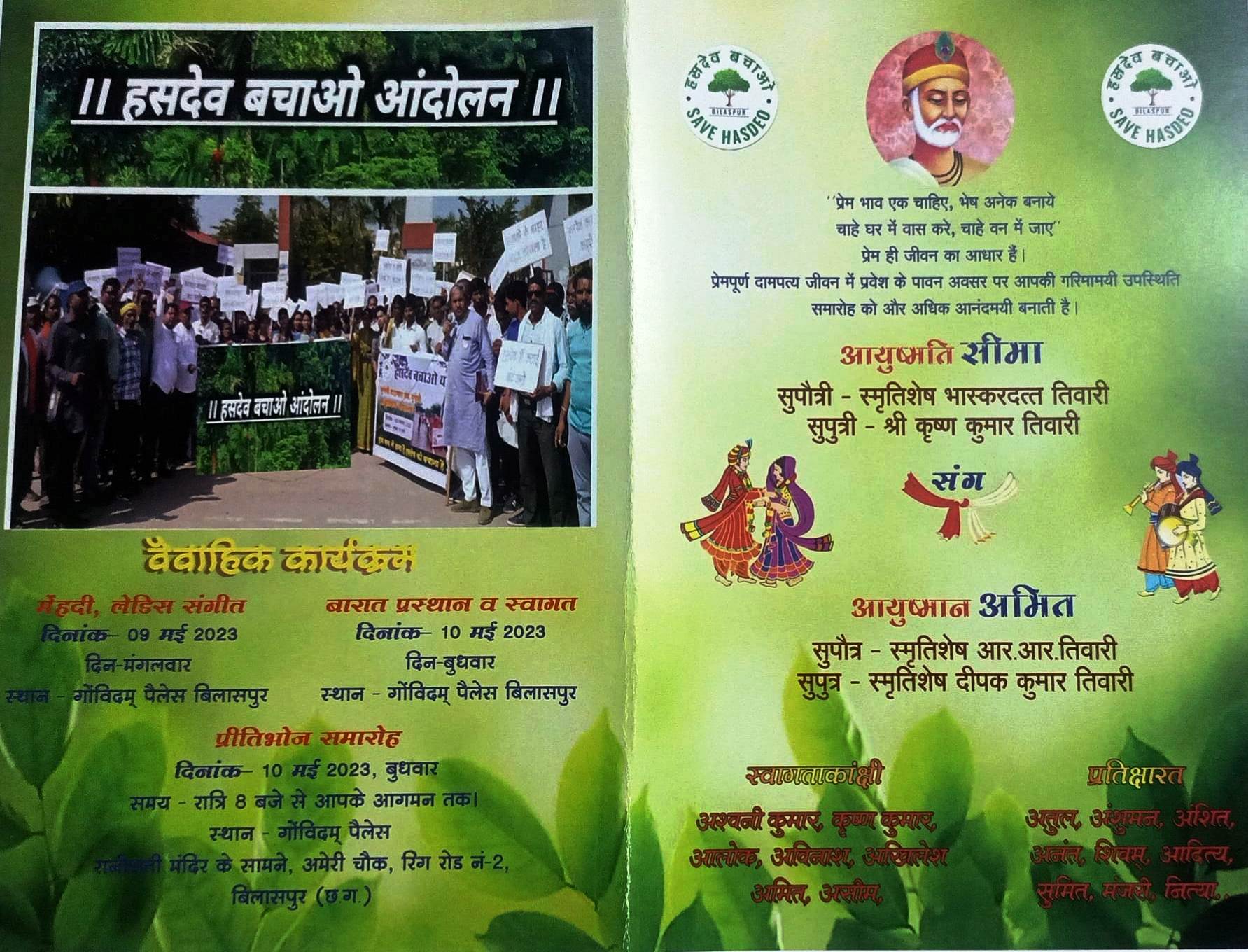 विवाह का निमंत्रण पत्र अब अपनी मिट्टी से प्रेम दर्शाने का ही नहीं, सामाजिक जागरूकता लाने का माध्यम भी बनता जा रहा है। इन दिनों अनेक ऐसे निमंत्रण पत्र देखे जा रहे हैं जो छत्तीसगढ़ी में हैं, या फिर उनमें पर्यावरण, स्वास्थ्य आदि से संबंधित संदेश दिए गए हैं। हसदेव आंदोलन को बल देने के लिए भी निमंत्रण पत्रों का उपयोग हो रहा है। ऐसा ही एक कार्ड सीमा और अमित के विवाह का सामने आया है। निमंत्रण पत्र के शीर्ष में हसदेव बचाओ आंदोलन का लोगो है और पीछे आधे कार्ड पर आंदोलन की तस्वीर है। जितने हाथों में यह कार्ड पहुंचेगा, वे हसदेव के लिए किए जा रहे संघर्ष के महत्व को समझेंगे।